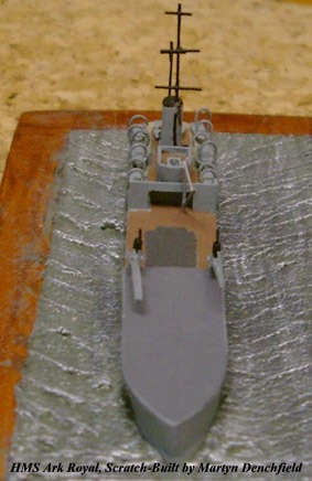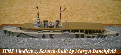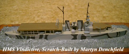 These are five ships in 1:1200 scale scratch-built by Martyn Denchfield. As can be seen, the emphasis is placed on naval aviation of the Royal Navy during World War One with models of HMS Ark Royal, HMS Campania and HMS Vindictive.