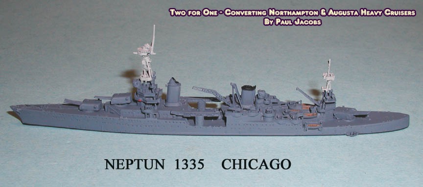 The six U.S. Navy cruisers of the inter-war Northampton Class fell into two sub-groups: Northampton, Chester and Louisville in one, and Augusta, Chicago and Houston in the other. The difference could be found in the elongated forecastle of the latter group, which enabled them to serve as fleet flagships. All six ships saw substantial service during the 1930's and in World War II, Houston and Northampton being sunk in 1942 and Chicago in 1943. All members of the class received repeated and sometimes substantial modifications both before and during the war. A number of models of these ships have been made by companies such as Wiking, Bassett-Lowke, Comet, Framburg, Superior, and Argonaut, but two of the Neptun models, which depict Chicago (N 1335) and Northampton (N 1335a) in pre-war states proved most satisfactory for me for simple conversions to other sister ships. The easiest of the two modifications was the Northampton. This Neptun model depicts the ship as she appeared after her fore funnel received an extension in 1935, which was unique among all the ships in the class. Otherwise the ship appears similar to her sub-group sisters. By removing the funnel extension, the ship can thus be made to represent either Chester or Louisville in the mid 1930's. To do this, I first used a small circular saw bit on my Dremel tool and carefully cut off the funnel cap. Preserving the cap, I then cut off the extension at the base, filed it flat and then, having cleaned the base of the cap, glued the cap onto the funnel. If done carefully, one can actually avoid having to repaint the model, other than to touch up the cap with black paint.