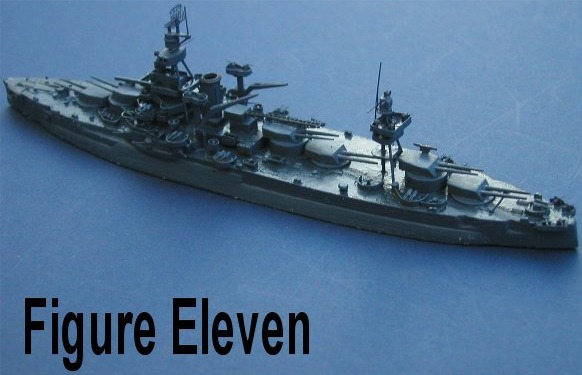 A very careful examination of the model and photographs will show that I took a very few "shortcuts" where the effect was minor compared to the amount of work needed to exactly reproduce the original. Also, it became obvious as I went along that the plans in reference 1 are not completely accurate for Arkansas in 1945. I used photographs and text references to make minor changes to the model versus the plans. Incidentally, having very detailed plans such as those in reference 1 are a godsend to the modeler in this and probably larger scales. Their value significantly outweighs the minor errors encountered.
