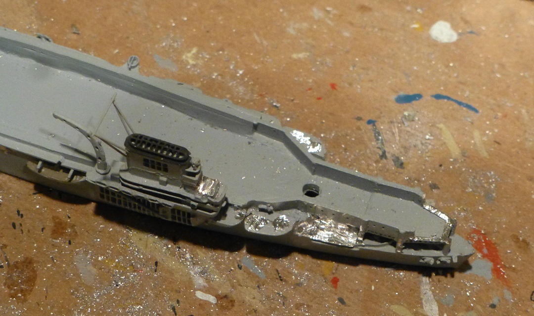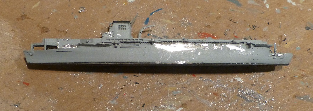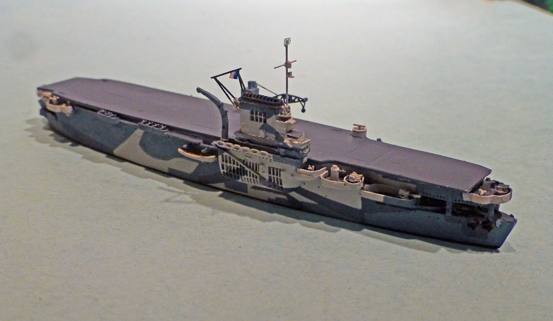 This model of the BEARN circa 1945 was converted from the Neptun model (N 1410) which depicts the ship as she was in the late 1930's. The attached photos show the progress of this conversion. A lot of parts had to be removed or altered. The flight deck had to be cut back by about a half an inch both fore and aft. Most of the boats had to be removed, the 6.1" guns and barbettes had to be filed off some of the catwalks removed and numerous parts had to be constructed and added on. The model was then painted in Ms 33: 5L, 5O, and 5N.