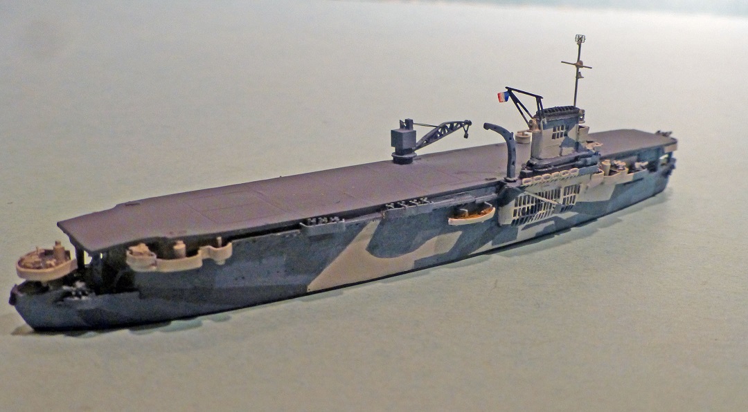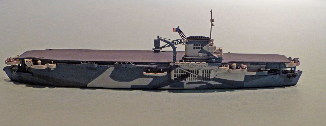 Utilized in the first few months of the war as part of the French force assigned to hunting down the GRAF SPEE, she subsequently was employed in training and then to carry the French gold reserves to Canada. After that she went to the U.S. to load up planes for transport to France. Enroute to France with her aircraft load, the Armistice caused her to divert to Martinique with her escorting cruisers EMILE BERTIN and JEANNE D'ARC. There, the ships were effectively interned and demilitarized under pressure from the U.S.