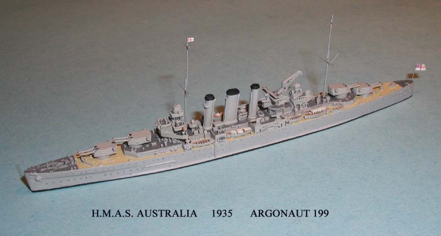 The thirteen eight gunned Counties were comprised of three classes, all similar in appearance, though differing in detail. The first group, the Kent Class, comprised seven ships, the Kent, Berwick, Suffolk, Cumberland, Cornwall, Canberra, and Australia. The second, the London Class, the Devonshire, London, Sussex and Shropshire, and the third the Dorsetshire and Norfolk. All thirteen ships had a simple, characteristic look: three evenly spaced funnels, two turrets forward and two aft. Over time, all of the ships underwent changes. It would require a great deal of discussion to enumerate all of them, but some of the major and most visible ones should be noted especially as these sometimes create confusion. It was not long after construction of the Kent’s that changes were dictated. The importance of ship board aviation soon compelled the addition of catapults. In the mid to late 1930's large box-like hangers were added to Berwick ,Cornwall, Suffolk, and Cumberland. The latter two ships had their quarterdecks cut down, as a weight saving device. During the course of the war, these hangers and catapults were removed on the surviving ships, thus once again altering their appearance. Although all thirteen ships were built with single four-inch guns, it was decided in the 1930's to replace these with twin shielded mounts. While this was accomplished in most ships, some still had singles at the outbreak of the war, and Canberra was sunk still mounting single weapons. All the ships mounted torpedo tubes. To accommodate weight increases, however, the tubes were eventually removed on all of the Kent’s. The Australia and Canberra received scant attention before the war, the most significant changes being the addition of catapults. But during the war Australia received substantial modifications, especially after being severely damaged by a kamikaze at Lingayen Gulf in January 1945.