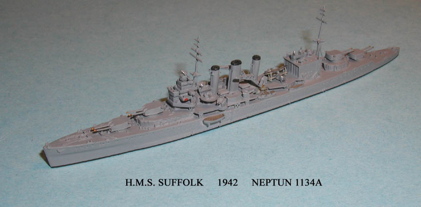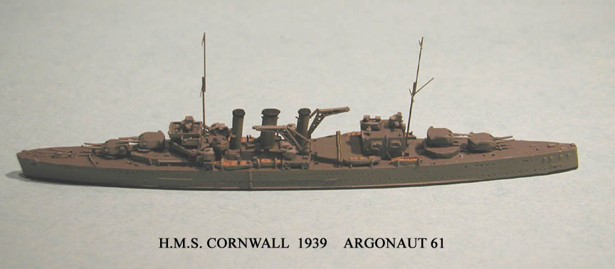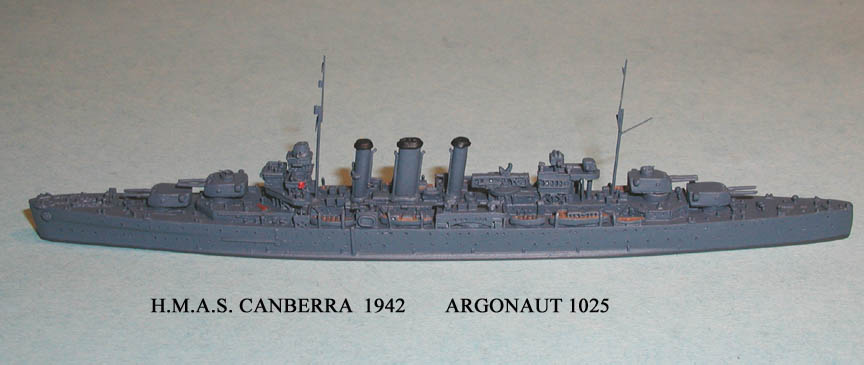 With the exception of the London, changes to the other two groups were much more circumspect. These ships were completed with catapults, and no hangers were ever installed. All these ships retained their torpedo tubes, but eventually had their single four-inch guns replaced with twin mounts. Suffice it to say that during the war all thirteen ships had their anti-aircraft armaments substantially increased, radar added and with rare exceptions, tripod masts replaced pole masts. The London was an unusual case. Before the war it was decided to rebuild the class along the lines of the Fiji Class light cruisers, but only work on London was commenced before the outbreak of the war. When the ship emerged from reconstruction in February 1941, her appearance indeed was similar to the Fiji, but the increased weight of the new structures severely strained the hull and she required a further refit lasting from December 1942 to May 1943. In retrospect it was fortunate that the other ships did not undergo such extensive reconstruction. London’s was not considered a great success and the Royal Navy would have been better served had the reconstruction not taken place. Nevertheless the ship served actively until she was retired in 1949. But in the end, the ship was actually scrapped several years before the rest of her sister ships, and even two of the Kent’s out served her. All of the ships saw extensive service during the war, proving their value by participating in numerous engagements and contributing materially to the successes of the Royal Navy. Of the thirteen ships, only the Cornwall, Dorsetshire, and Canberra were lost, the first two in April 1942 to Japanese dive bombers, and the latter to gunfire and torpedoes at the Battle of Savo Island in August 1942.