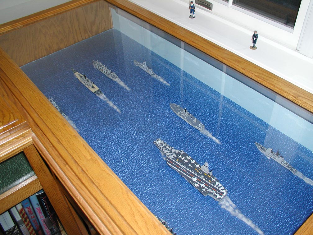 3. Table top cases: Table top cases may be built in or portable. Either way they have to be placed somewhere and they generally take up much more floor space than vertical cases. Although they can be used to display many models in rows, they are especially useful for dioramas. The negative, however, is that they are not effective for displaying large numbers of models because they cannot be used vertically thus eliminating the use of a lot of air space. Nevertheless, diorama display is generally of greatest interest to non-collecting visitors, particularly as larger models can rarely be displayed in such a manner, making 1200/1250 scale models uniquely suited to this medium.