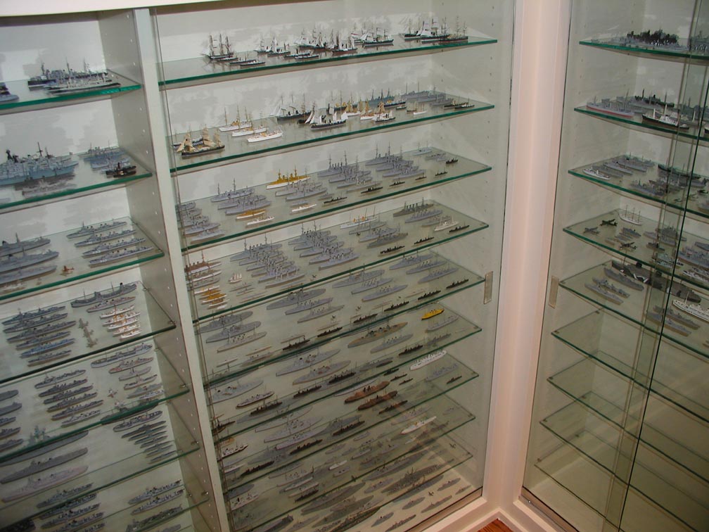 The issue of what is the most effective way to display one's collection, regularly comes up for discussion on the message board. The question is often asked: what is the best way to display the models? I don't think that there is a right answer. The "best" way, depends upon a number of factors. Some think that the most effective display is wall cases that are only deep enough that one model can be displayed in a row. But table top dioramas are very effective, and obviously are a totally different visual display than thin wall cases. Shelves with depth are effective when the collector wants to show a group of similar ships for comparison purposes. Wall cases that are only an inch or so deep look good, but do not maximize display space. Table top dioramas create interesting displays, but dioramas take up maximum space for the number of models displayed, and so are a very poor medium for displaying large numbers of models. In short, there is no "right way."