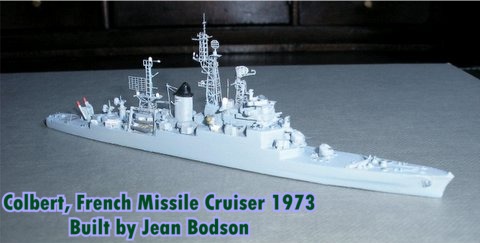 Robert F. van Oosten sent in photographs of two scratch-built models and two rebuilt models. From the Netherlands there is the French missile cruiser Colbert as from 1973 after reconstruction. The model, scale 1250, was made by Antwerp member Jean Bodson. He used a polymer for the model and a lot of photo-etched details. The model of Gloire is in wood and was constructed in the USA during WW 2. Jean Bodson repaired and improved this Admiralty Model, one of several which were made for instruction purposes during the first years of the Cold War. Jean also reconstructed the Admiralty Model of Göta Lejon, Swedish cruiser as rebuilt in 1952.