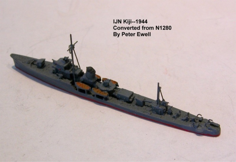 The torpedo-boats also provide fruitful subjects for conversion because not a lot needs to be done. Kiji illustrates a typical late-war anti-submarine fit, with one 4.7" mount landed in favor a triple 25mm and numerous single 25mm, plus radar and enhanced depth charge capacity. This was my first IJN conversion, based on the little information available in published sources before I discovered the j-board.
