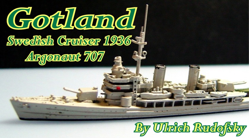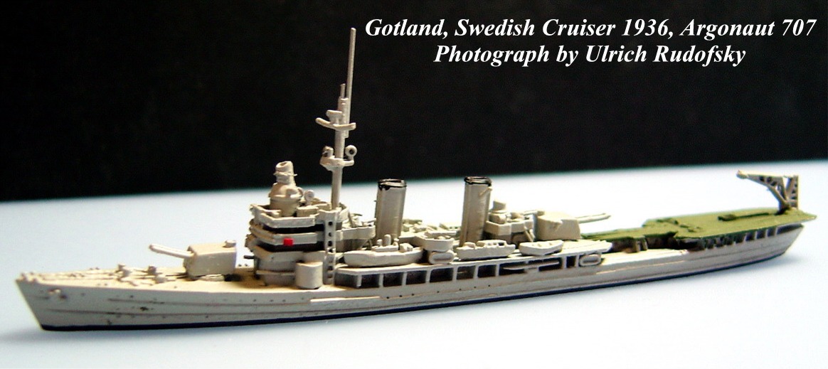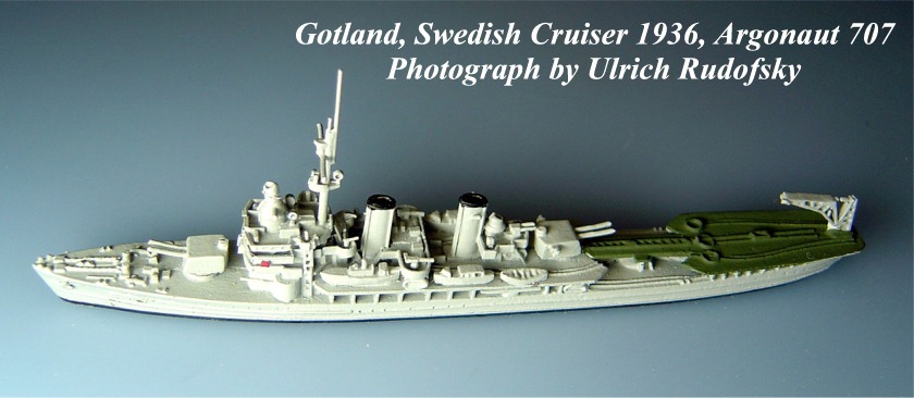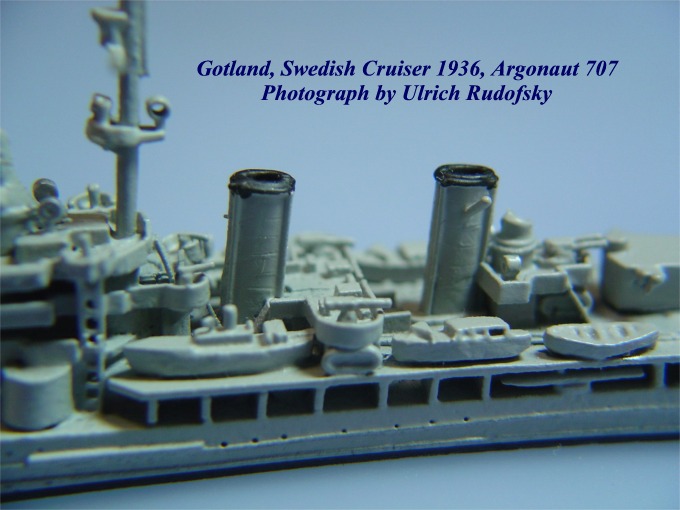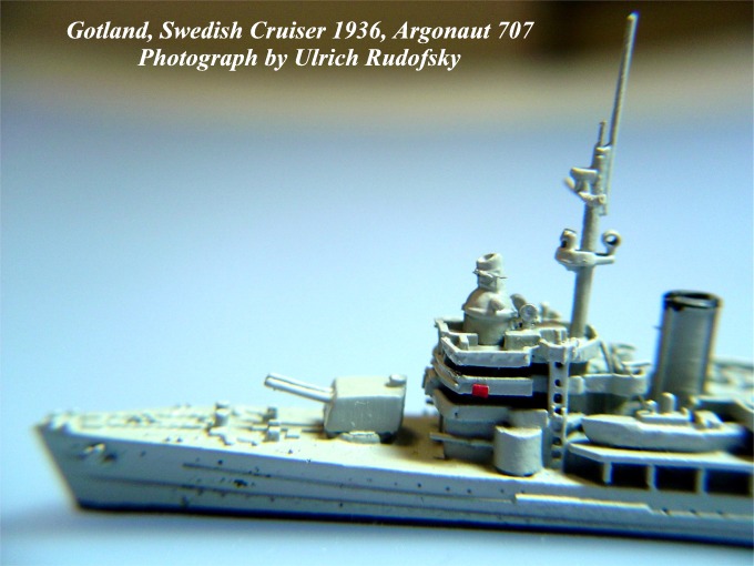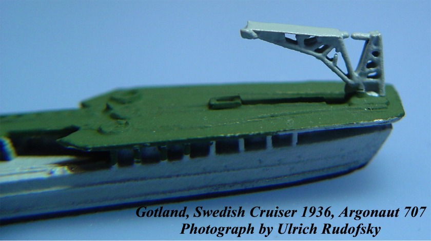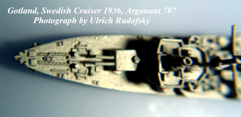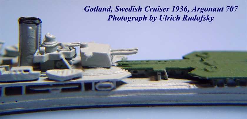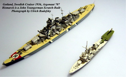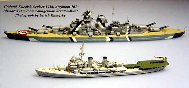 The cruiser GOTLAND of the Royal Swedish Navy played an historically pivotal role in the ultimate fate of the BISMARCK. Three models and several versions of the cruiser GOTLAND were produced: Wiking made at least 8 variants between 1938 and 1956 of the model (See: Ulrich Haevecker, Handbuch der Wiking-Schiffsmodelle, Volume II, S478), Rhenania 90 (1941 state), Argonaut 707 (1936 state). The GOTLAND, shown here, is the Argonaut model. The 1938 Wiking model (No. 3001) I have, is a rather plain pre-WWII version, and I doubt that the later versions were very much improved. I have seen photos of the Rhenania 90 on the "Producer’s Gallery", which is considered to be the best by some, but it is quite similar to the Argonaut model except that it has more deck gear aft and the Argonaut has more detail at the bow. I tend to think that the Argonaut model I have just acquired may have been at least partially repainted and remasted. The green aircraft recovery deck and catapult and single yardarm mast are not as shown on the Oliver Maertens’ photos on the Internet of either the Rhenania or Argonaut versions. The Argonaut GOTLAND does not have Neutrality markings, i.e., 1936. I took the liberty to take some high resolution close-ups that bring out the casting details and also, unfortunately, magnify the some aspects unreasonably out of proportion. If the photos of the Rhenania model posted in the "Producer’s Gallery" do justice, then I would bet the Argonaut model is its equal, although it does not carry the Hawker Osprey. [The BISMARCK is a 1:1200 scratch-built wood model made by John Youngerman].
