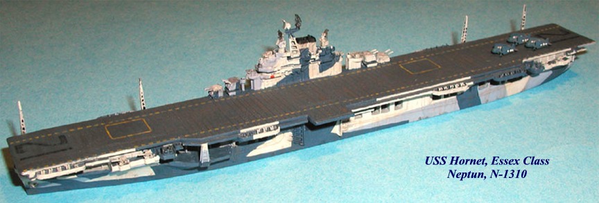 This model was modified from an older Neptun Essex, by the addition of port and starboard catapult outriggers, which were made from styrene. The number 3 radio mast, as well as a radar outrigger on the starboard side of the funnel were removed. Two 40mm Quad mounts were placed on the starboard quarter, and SK and Mk 37 radars from Navalis were installed in place of the standard Neptun radars. The Navalis SK requires minor assembly. This was not a problem, despite it's small size. Navalis radar sets include a variety of different radars.