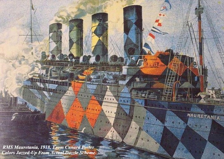 When World War I finally arrived, however, these large ships proved too vulnerable for cruisers and were instead employed in the more suitable roles of hospital ships and troopships. Initially retaining their commercial liveries, the British liners were either progressively "darkened" against the submarine threat as the war progressed by painting out their funnel colors in gray or black and their hulls in gray of uniform or graded tones, or were given the universally mandated white hulls with red crosses and green bands of hospital ships. Beginning in 1916, however, British ships in increasing numbers began sporting an astonishing variety of brilliant colors in abstract patterns following the theory promoted by the artist Norman Wilkinson, supervisor of the Royal Navy’s new "Dazzle Section", that the proper application of distinctive colors and patterns would protect a ship from submarine attack by obscuring her silhouette, course and speed.