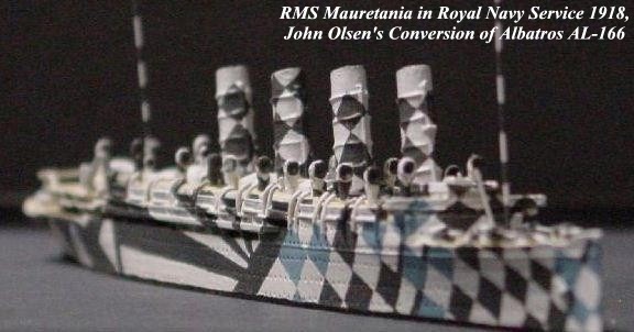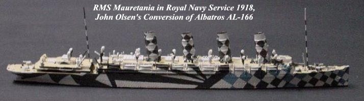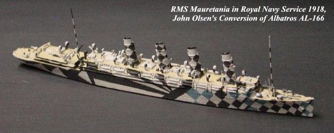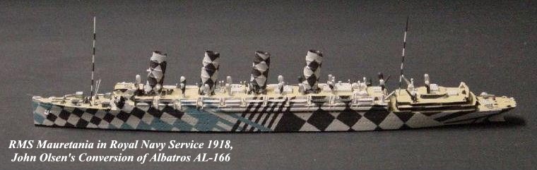 Among the most distinctive of Wilkinson’s designs was the harlequin-square pattern applied to Mauretania when she reverted to an armed cruiser in January, 1918. Though she served more as a troopship and repatriation vessel during this commission, she was given an armament of at least six deck guns, probably 4.7-inch, and may have been intended to fill the role of convoy escort. Several good photographs survive, one of which was adapted by Cunard as a promotional poster and jazzed up with an array of reds, blues and yellows. While this may have served Cunard’s interests well in reviving postwar interest in travel, this image has caused understandable confusion among modelers and others, including David Williams, author of Liners in Battle Dress and Naval Camouflage 1914-1945, for whom it served as the only available color representation. However, a look at the original pattern sheet in the IWM archives, reproduced in the Time-Life Seafarer’s series, "The Liners", shows a more sedate palette of gray, black and blue that is consistent with the even tones of the black and white photos.