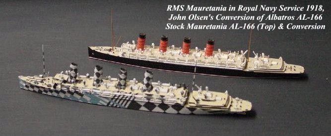 Though sorely tempted by the more vivid poster colors, I took the more accurate historical approach in modifying my Albatros model, which shows the liner in her 1913 form. Her external modifications seem to have been limited to the addition of the six deck guns, which I appropriated from my Neptun models of the German hilfskreuzers Thor and Komet for lack of anything better, though others more familiar with her history or with access to better sources may disagree. I applied the pattern with no more than a brush, 4 colors of Pollyscale paint. Three that I mixed as closely as I could to the pattern sheet colors plus Old Concrete for the wood deck were used, and a steady hand, using both the photos and the pattern sheet as a guide.