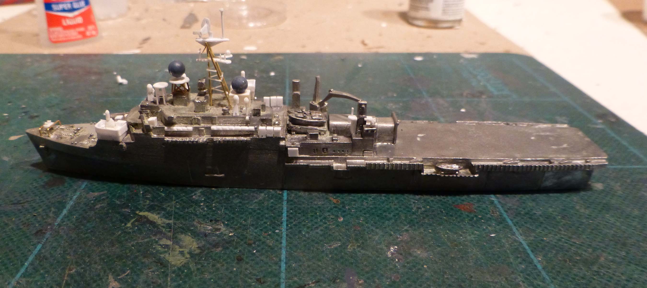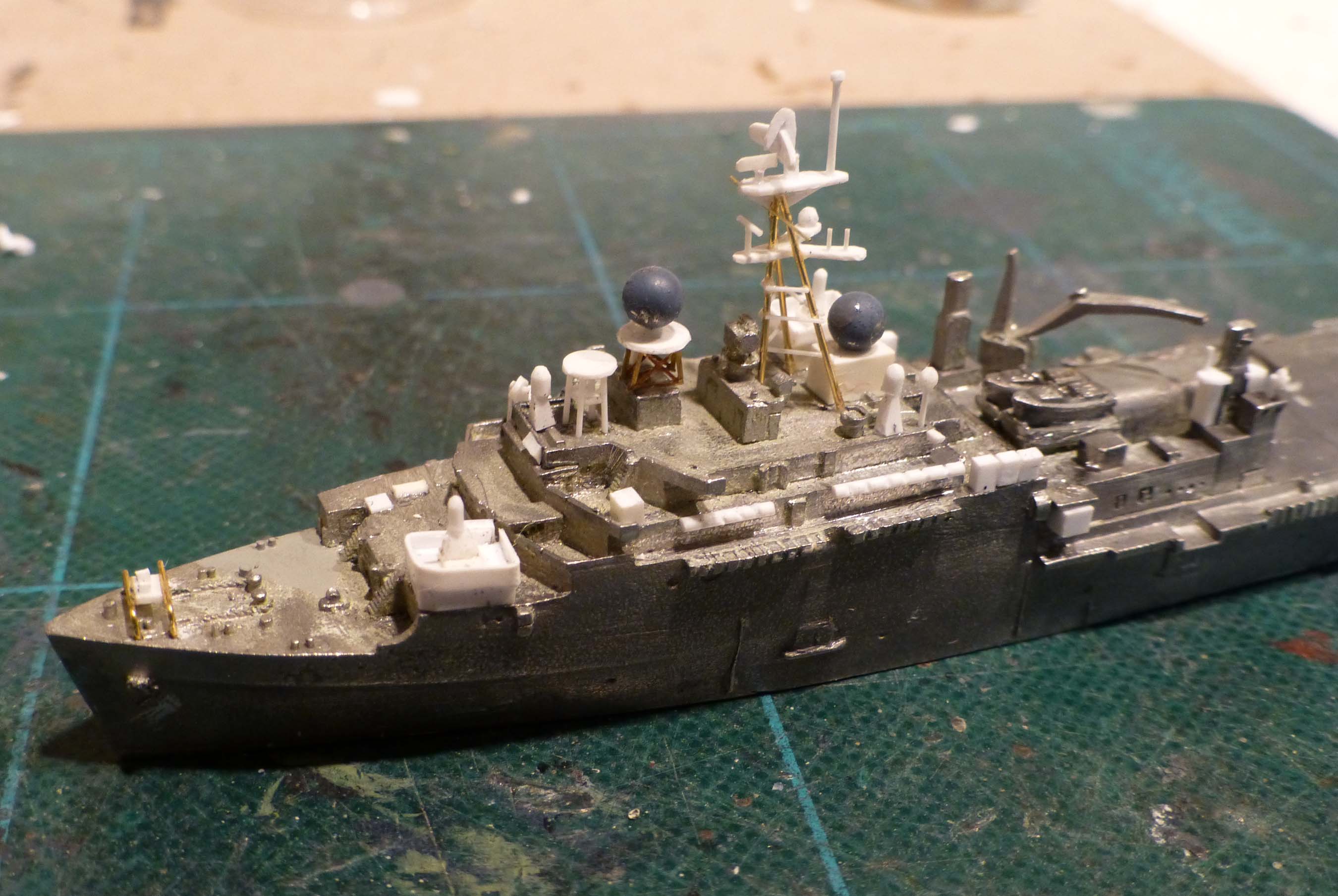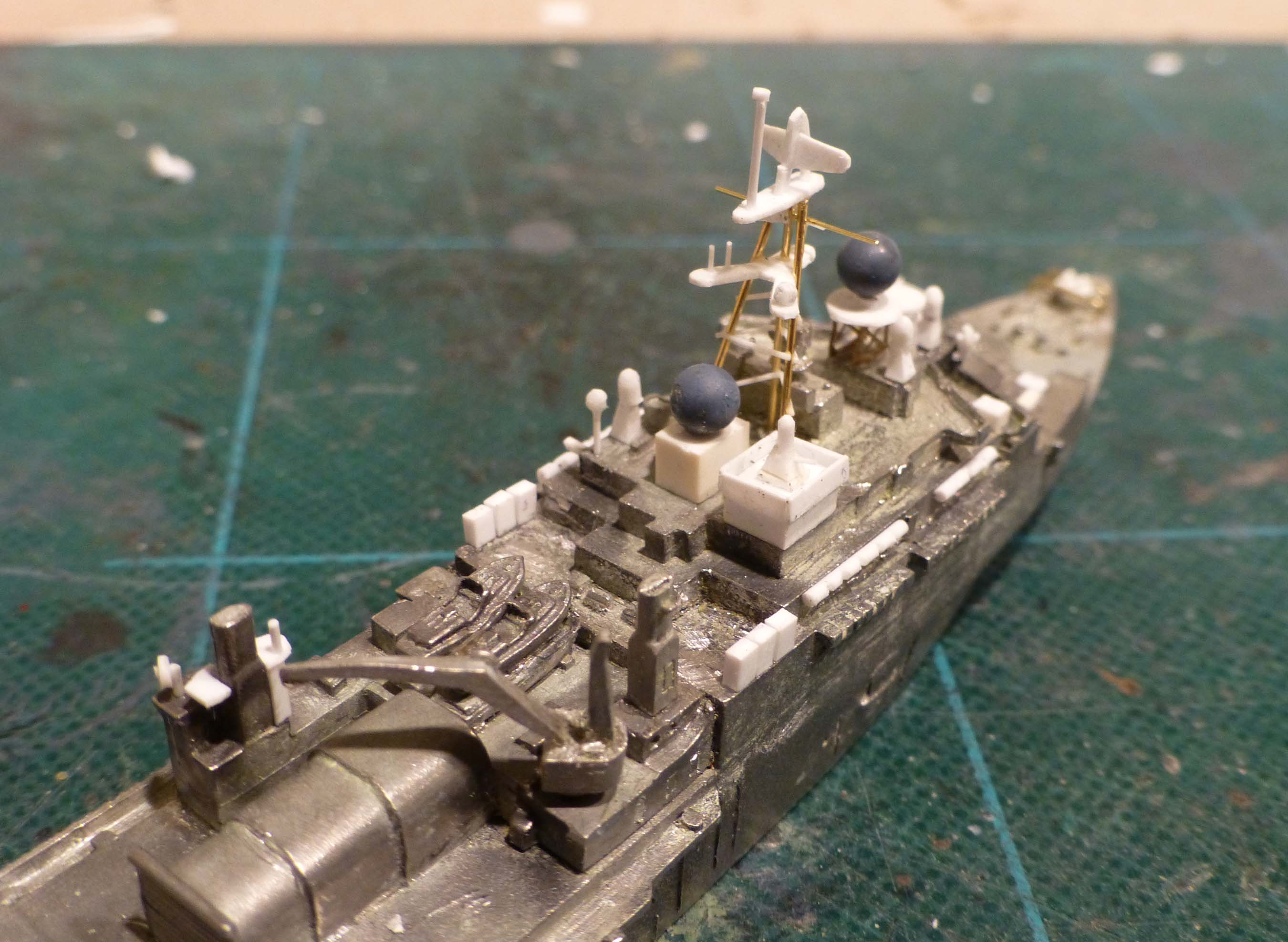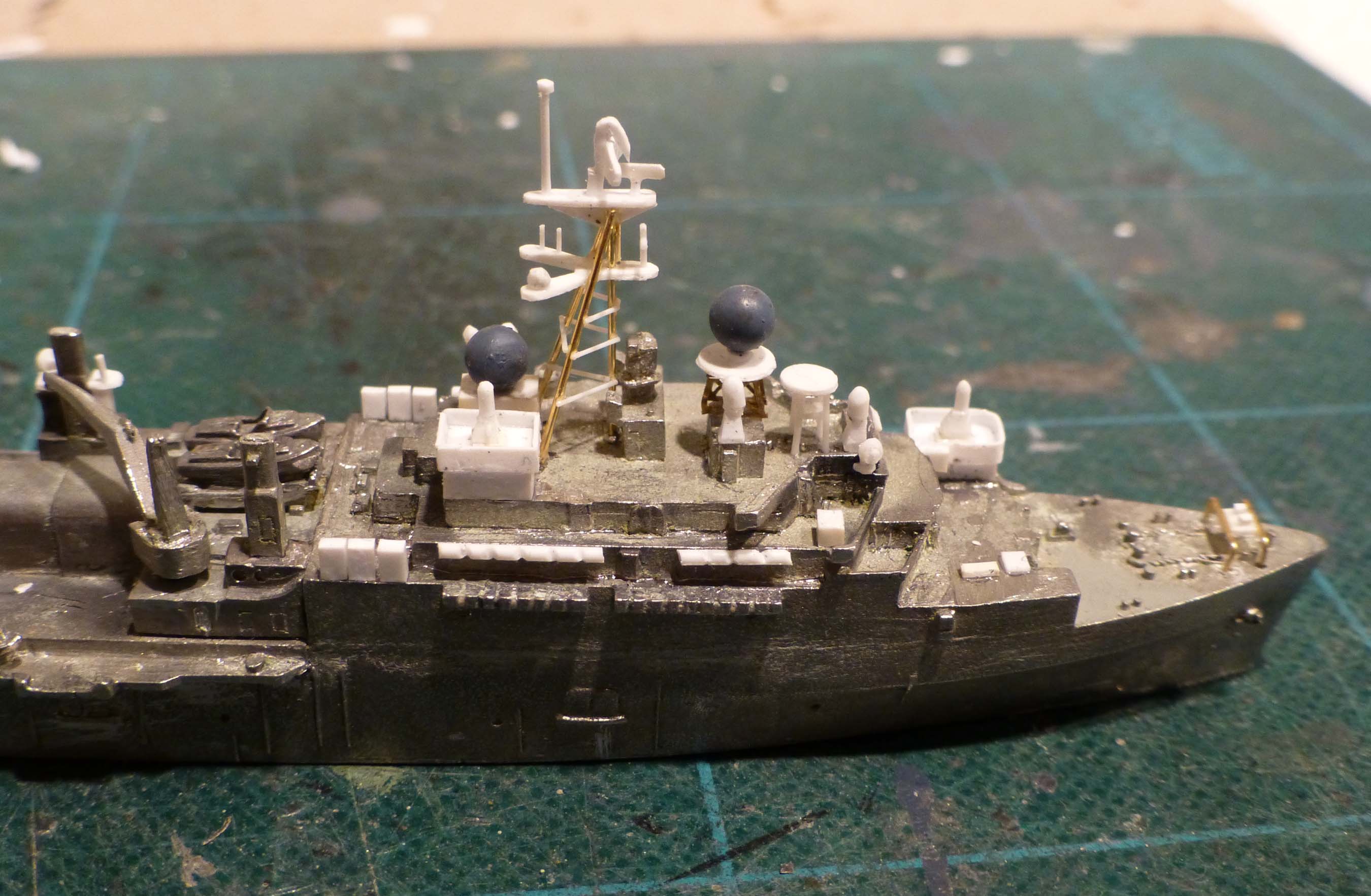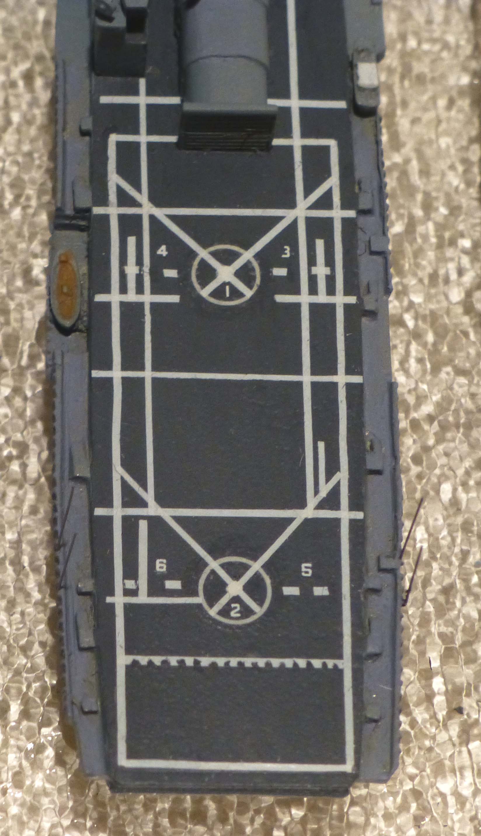 The most time consuming part of that was applying the decals to the helicopter deck aft. I had official Navy Dept documents showing these markings and their locations, so I was at least able to follow a precise plan.