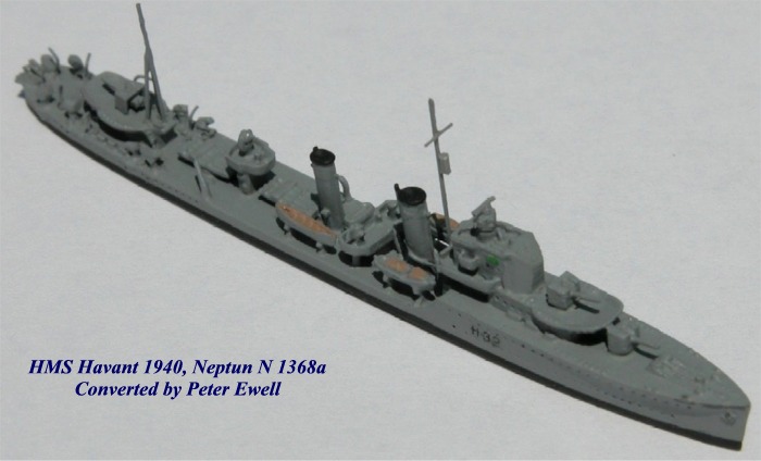 HMS Havant was very similar in concept to HMS Walker, but required creating an angled bridge front for the standard Neptun G-H Class destroyer (N1368a) because these ex-Brazilian destroyers had this feature. This was modeled from a solid piece of lead and filed to shape. The DCTs were built in a similar fashion to Walker's.