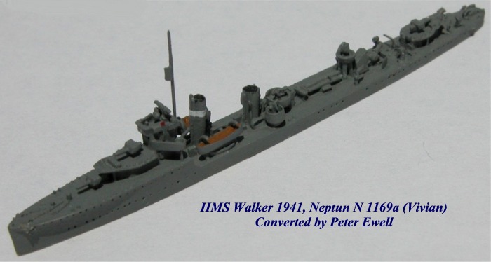HMS Walker was my answer to Neptun's rather puzzling issue of multiple VW-Class destroyers in pre-war rig. I started with Neptun's model of Vivien (N1169a). The 12-pounder aft amidships was a re-work of one of the existing 4" mounts and the DCTs were scratch-built from plastic by first inserting a plastic rod in the deck, filing it down, then perching a slightly bigger piece of cut plastic rod to form the depth charge on top of it. The extra pair of 20mm in tubs amidships came from the parts box, actually, they were surplus to the LST "swap" described above.