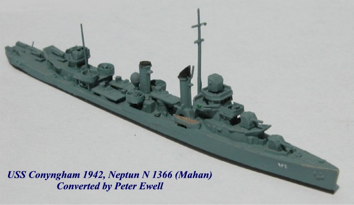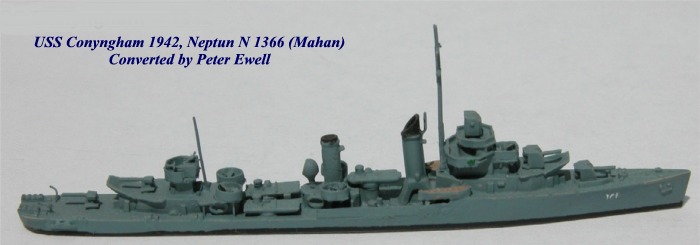 Adding Detai-. Another simple way to begin is to start with a relatively clean model like the Neptun unmodified USN Destroyers in pre-war rig and add additional equipment and features. This has the advantage of not having to carefully cut up the existing model to preserve the parts you need later. An early example for me was USS Conyngham in 1942. Here I started with Neptun's as-built model of Mahan (N1366). The first step was to cut away the massive tripod mast and forward searchlight, the number-three 5" mount, a pair of boats, and the searchlight platform aft of the second stack-as well as remove the twin 50 caliber mounts fore and aft. With everything filed clean, the objective was then to add scratch-built 20mm mounts as needed and some small finishing details. The 20mm tubs in the waist and forward on the aft deckhouse were fashioned from plastic drinking straws, while the mounts themselves are thin copper wire punched through card stock and cut to size. Additional 20mm were added side-by-side on top of the gun-crew shelter forward of the bridge in place of the twin 50 caliber mount, and two additional 20mm in super-firing positions on the aft deckhouse in place of the other twin 50. These required enclosure by light bulwarks, which were made from sheet copper. Finally, bulwarks in the waist were added back to the first set of tubes, made from sheet plastic with any gaps filled and sanded. A new pole foremast and some additional detail in the form of DC davits finished the model up.