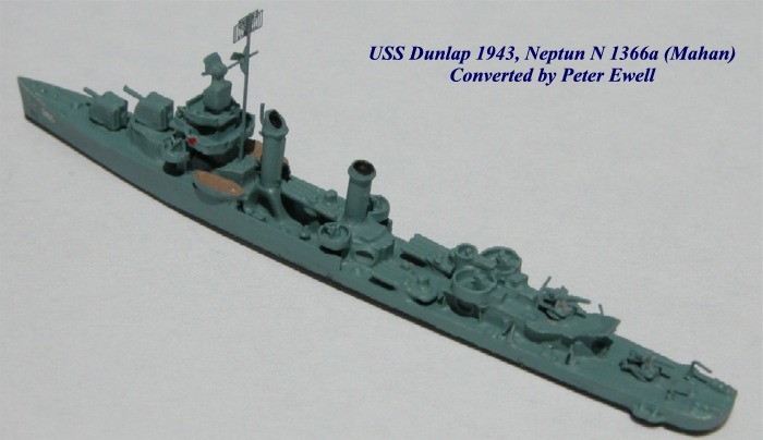USS Dunlap was one of two Mahans that carried her forward 5"/38s in enclosed mounts but otherwise differed little from their sisters. A standard Neptun modified Mahan (N1366a) thus worked fine for the basic model. The enclosed 5"/38 mounts came from Neptun's Barnegat (N1391), which I love to use as a parts source because these light seaplane tenders almost never actually carried the designed armament as portrayed by Neptun. N1366a as supplied is inaccurate in one detail for a late-war destroyer because it lacks the typical bulwarks in the waist, which I fashioned from sheet plastic, as I did with Conyngham. This model was also my first experience with the new Navalis photo-etch radars, which help a lot.