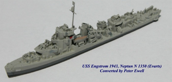 I have since applied this basic idea to other pairs of models. For example, both Neptun versions of the Rudderow Class (N1353 and N1353a) carry quad-forties aft, although the first of the Rudderows built were equipped with twins. Similarly, both as-issued Neptun Cannon versions (N1352 and N1352a) carry twins in this position, while many were later enhanced to mount quads. Swapping these mounts provides two new models of each. Similarly, Neptun's standard Sumner (N1360) has two sets of tubes while Gearning (N1360a) has only one with an additional quad forty in place of the aft set. Swap the tubes for the AA mount and you have an early Gearing and a late-war Sumner.