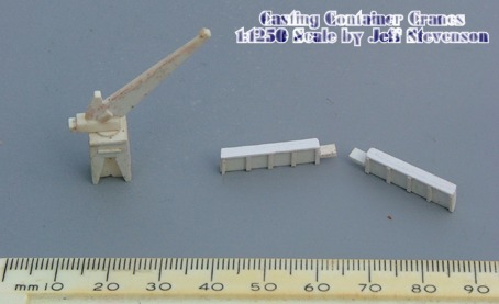 In this article I will describe how I set about making my own models of dockside container cranes and associated railroad cars in 1/1200 scale. As casting white metal in hand-held moulds is involved, with the potential for serious burns and other injuries if mistakes are made, this is most definitely NOT a project for an inexperienced model maker or a beginner. However, by adhering to the supplier’s guidance on Health and Safety in the use of the materials, the techniques described and processes used should be within the skill set of any experienced model maker. I live in England and obtain the silicone rubber and white metal used from Alec Tiranti - visit www.tiranti.co.uk for information on products. Modellers elsewhere should be able to locate local suppliers through a Google search for silicone rubber and white metal. There are several different styles of crane in use and after some difficulty in sourcing accurate plans I decided to make a ‘generic’ model that embodied all of the key elements of this type of crane. As I intended to display the cranes in a dockside setting (using Tri-ang Minic quays) I also decided to make some railroad equipment to give some ‘life’ to the display. I was provided with some information from fellow collectors via the 1250 Board and gratefully acknowledge the help provided.