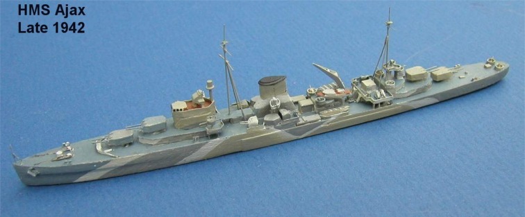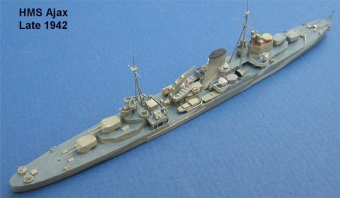 HMS Ajax, CL, 1942, #2, #3 | 1:1200 balsa wood scratchbuild from John Youngerman |