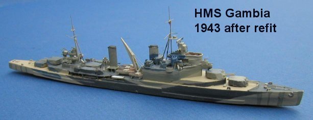 HMS Gambia, CL, 1943, #2, #3 | 1:1200 balsa wood scratchbuild from John Youngerman |