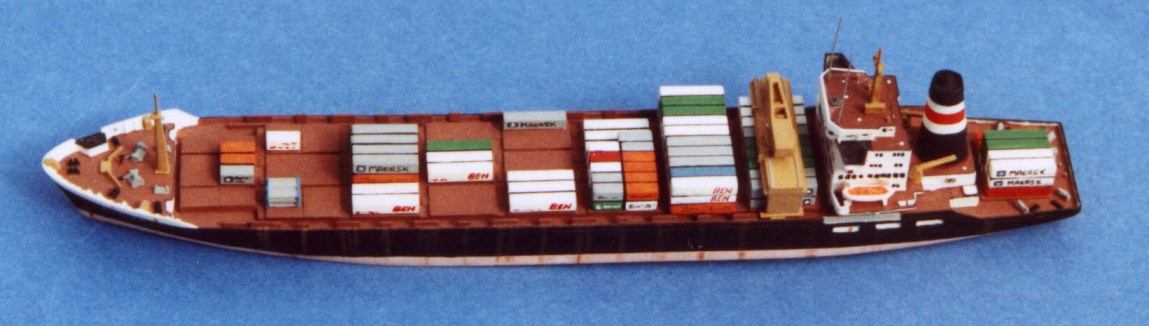Author, #2 | Sean Pritchard writes..." based on a near sister produced by CM.I got Carlo's permission to modify the model-new bridge block and a lot of work to hull,fixtures and fittings-certainly not a copy by the time I'd finished it.Made about 20 or so for the Kassel meeting about 8-9 years ago. It is the Harrison ship "Author",Polish built,and with the container support racks on the side of the hull these ships had very distinctive and prominent weathering-in fact the rust is understated!" |