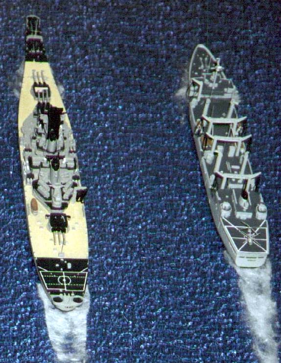 | BB Iowa Scene | Diorama showing BB Iowa and AOE Wabash circa 1988. These are Trident Alpha models painted and decaled by Paul Jacobs | |