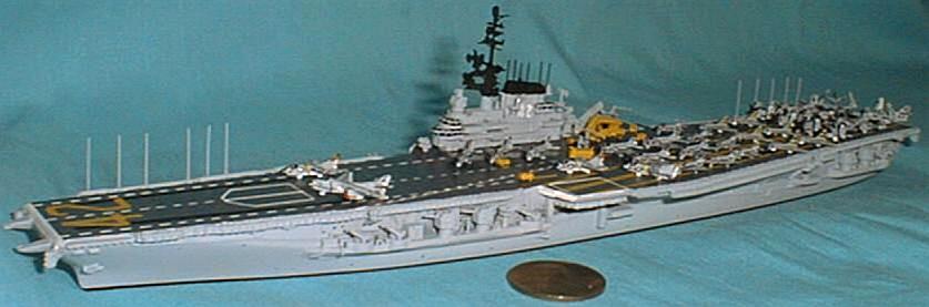 | USS Forrestall (1957) | This wood model by the late Cy Broman was acquired in poor condition and is shown after repairs, detail enhancements and repainting by Paul Jacobs. Aircraft are various commercially made models enhanced and hand painted. | |