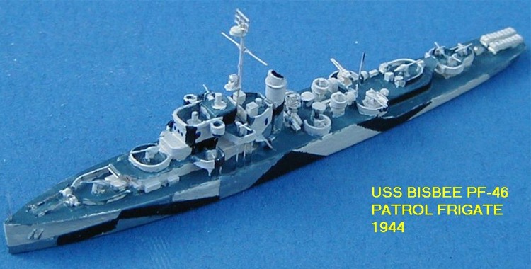 USS Bisbee, PF-46, 1944, #2, #3 | 1:1200 balsa wood scratch-build from John Youngerman |