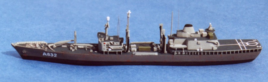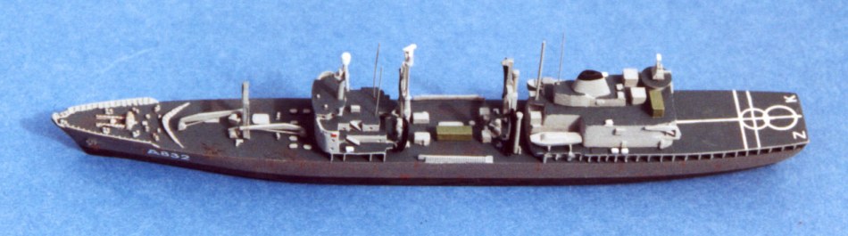 Zuiderkruis, #2 | A Sean Pritchard conversion..."It is the dutch replenishment ship Zuiderkruis. The model is from a bare metal casting made by the now defunct ATS (ATS 11 in fact) which I think were produced by Sextant.It has had quite a lot of work done to it-new masts, RAS gear and hoses from copper wire from household flex) new boats,scratchbuilt "goalkeeper"CIWS, and in addition has had a whole new section of hull added to the bottom of it, to give the "light" appearance. Decals came from my own stocks, ut cut about to make the correct pattern and codes. Quite a nice model,and a change from USN or RN." |