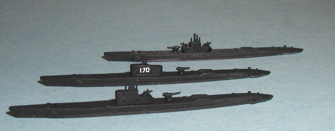 1. Trident Alpha 10346 CACHALOT: Although this U.S. Navy submarine model is no longer in production, it can still be found (as of the date of this article, March 2012, Peter Wiedling still has the model in stock). This model can easily be converted to two different models. The photo shows three versions. The model in back is factory version, which depicts the ship as she was in 1944 after her final modifications. The middle model is a conversion of the factory model to pre-war, and shows the ship as she and sister shipCUTTLEFISH were originally built. To do this one, you must remove the deck gun and glue it aft of the conning tower. The small gun mounts on the conning tower must be removed and the cut outs for them filled with pieces of strip plastic and then cut and sanded to shape. The model in front depicts CUTTLEFISH as the ship was in 1943 before its final modifications. Again, the deck gun must be cut off and moved aft. The forward part of the conning tower must be filled in and sanded to shape. Photos of these two ships are readily available in books and on the web. Navsource is a good reference.