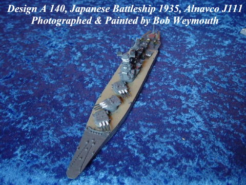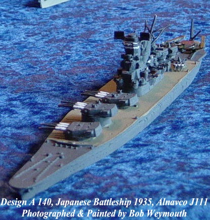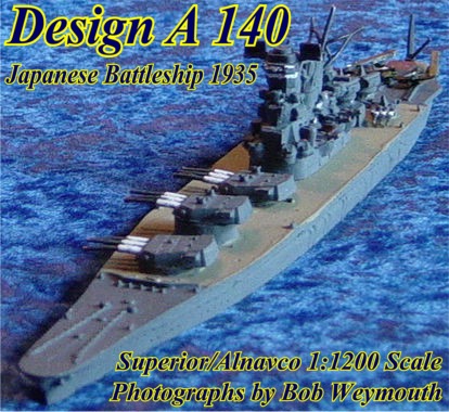 These are three pictures of the Japanese preliminary design to the Yamato. Designated Design A140, it was developed in 1935. The model is by Superior (Model No. J111) and is a new release in 1:1200 scale. It is not exactly as the original plans indicate as she has a flush deck along the entire hull aft to the aircraft deck, she has the later Yamato superstructure, funnel and mainmast. However, she is lengthened and has her main batteries forward and all four secondary triple turrets aft.