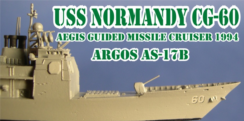USS Normandy CG-60 was laid down at Bath Iron Works, Bath, Maine, on April 7, 1987, launched March 19, 1988 and commissioned on December 9, 1989. The design used the same hull and propulsion as the Spruance Class destroyer but the rest of the design was greatly modified to incorporate the Aegis phased array arrays. Normandy as the 13th of the 27 ships in the class, exactly the halfway point in the production line. She incorporates the vertical launched missile system rather than the two Mk 26 twin rail missile launch mount found in the first five (CG-47 through CG-51) ships. Starting with USS Bunker Hill CG-52 in 1984 all of the class were built with the vertical missile system. Argos produces an exceptional model of Normandy shown as of 1994(AS-17B), which is available from Chris Daley at 1250ships.com.