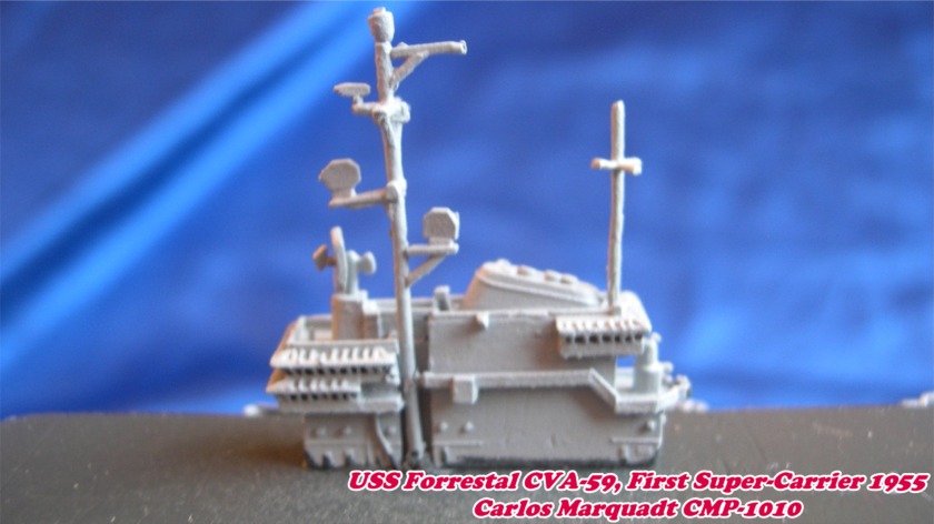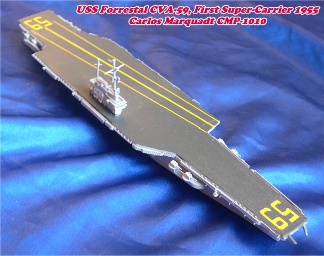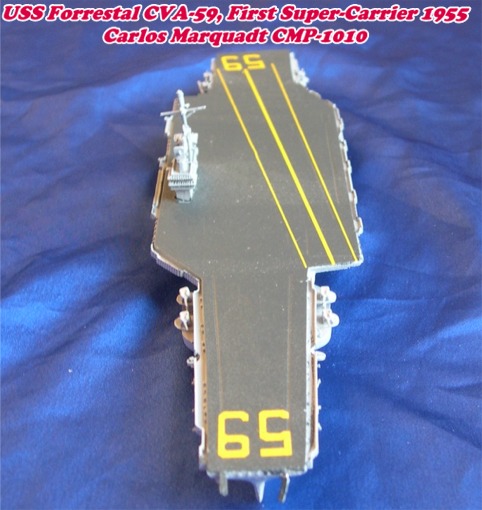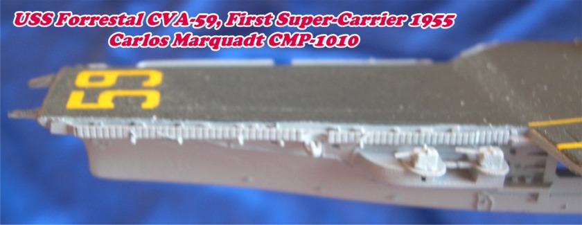 The design of USS Forrestal CV-59 owed much to the aborted USS United States design. The Forrestal was even larger than the United States and 15,000 tons heavier than the Midway class. The Forrestal had the four deck edge elevators and quarter gun sponsons, each with two new 5-inch/42 MK54 rapid fire guns. The forward sponsons were too low and subject to damage by the sea at high speeds. They were removed starting in 1961. The design was also the basis for all subsequent USN carrier designs. Carlos Marquadt produces a model of USS Forrestal CVA-59 as built 1955. CMP-1010 has all of the original gun positions, as well as yellow deck numerals.