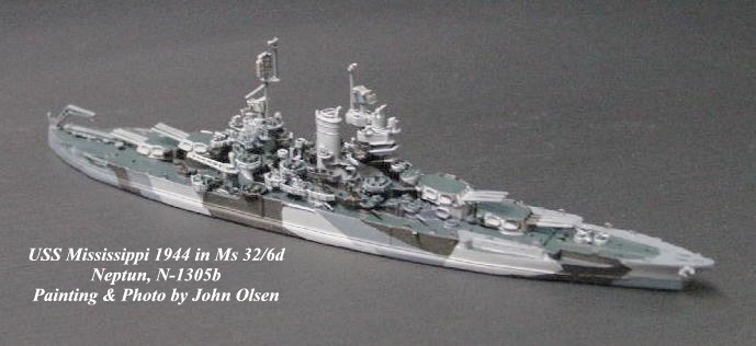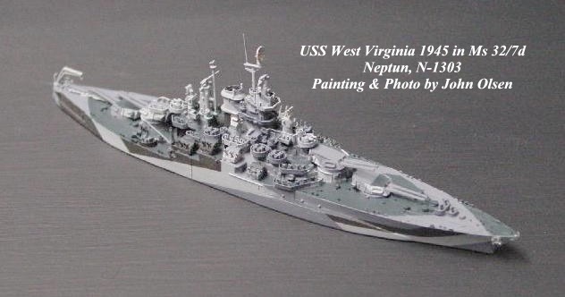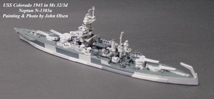 Other decisions are less straightforward, as in US ships depicted early in the war when Navy Blue replaced Sea Blue as the dominant "dark" color, and late in the war, when the fleet gradually went over from a blue range of colors to neutral grays. Analyzing these shifts requires keen photo interpretation skills and careful evaluation of a host of variables including light conditions, sun angles and type of film used These are difficult and often impossible to interpret from black & white photo evidence, since the tones of these color ranges are so similar. For example, BBs New Mexico and Idaho, both modeled by Neptun in late war versions, carried a solid Navy Blue MS21 during early to mid 1945. In July 1945 Idaho was repaired in the Philippines from kamikaze damage received off Okinawa, at which time she was probably repainted, but it remains unclear whether a blue or a gray MS21 was used. I decided in favor of the Navy Gray MS21 to set her off from my Navy Blue New Mexico, but the basis for my decision is not on as sound a foundation as I would normally prefer.