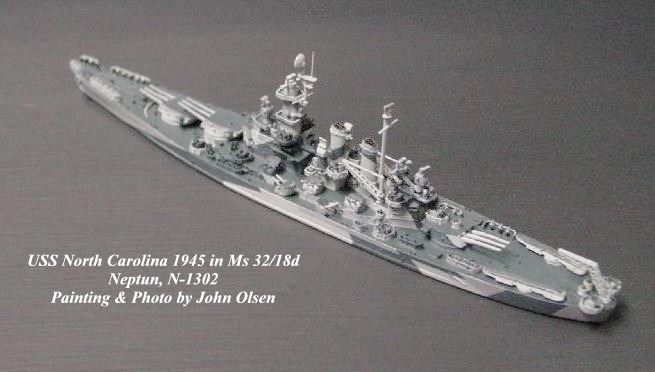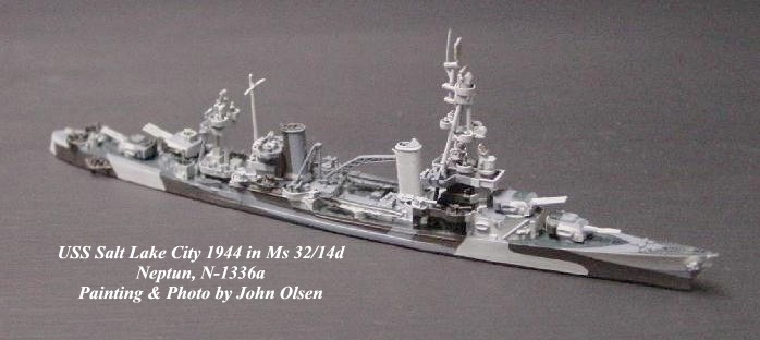 Apart from a few minor errors in detail, Neptun models are usually accurate enough to fix the specific time period represented for any given ship down to the exact month. This is especially important for WWII ships because camouflage measures were frequently changed, particularly during yard periods, when other minor changes in radar and AA fits were made. Correlating the details of the model with those shown on photos is essential in determining whether, for instance, Neptun's CV Ticonderoga should be painted in a MS32/10A pattern (carried in late 1944) or the solid Navy Blue of MS21 (applied at Puget Sound in April, 1945). The Neptun model portrays the ship after her refit of Jan-Apr, 1945, during which, among other changes, the sponsons for the 40mm AA on the starboard side of the ship below the island had been removed; therefore my model appears in MS21. However, 10A is such a neat pattern that I took my old Trident/alpha Ticonderoga (the 1944 version) and painted her up as the Shangra La, which also carried 10A at that time.