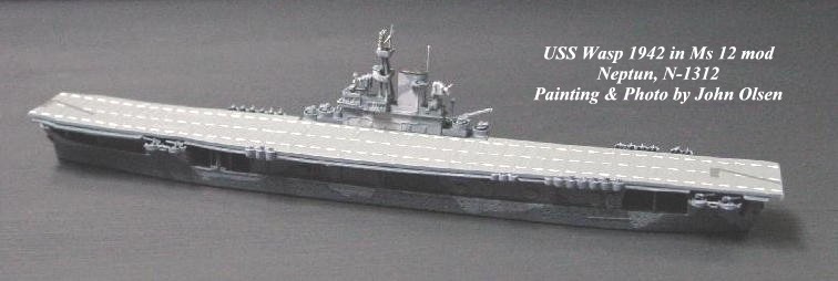 Apart from my Trident/alpha Ticonderoga/Shangra La, the only other non-Neptun model I've done in this series has been the Optatus Gambier Bay, a dead ringer for Neptun's Casablanca (which I painted up as Guadalcanal) and was probably produced from the same master, like other Optatus-Neptun duplicates (Taiho, Katsuragi, etc). Gambier Bay is sold already camouflaged, but the colors are not correct and the pattern is slightly off. I've repainted mine to bring it more into line with the rest of my fleet. As for "scale effect" (lightening the colors to compensate for the implied distance at which models of this small size are perceived- does that explain it right?), I prefer to use my colors at full strength. Perceived saturation varies with distance. Viewing the models close (say one-inch) implies a distance of 100ft and color saturation pretty close to full strength. Viewing at mid distance (say six-feet) implies a distance of 600ft and a reduction (lightening or neutralizing) of saturation according to that specific distance. This can be determined mathematically but nobody has yet bothered to do this. Changes in the viewing distance of small models are multiplied greatly by scale. A scale effect formula to correct for, say, a 1000 feet observation distance would be meaningless, since an observer would have to view the model at a consistent distance of ten-feet away. We know of course that this is never the case, except for dioramas under glass. Any closer or farther than ten-feet and the true effect would be off. So why bother?