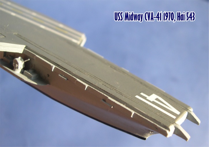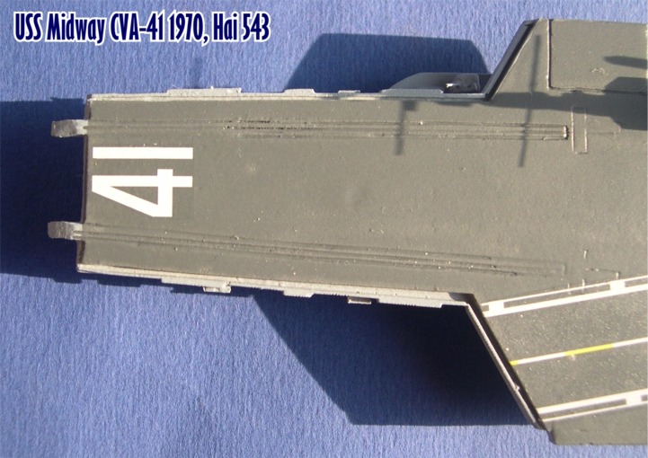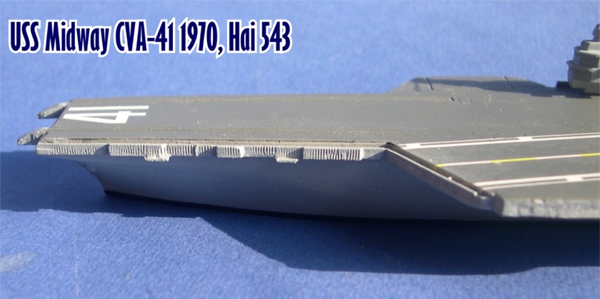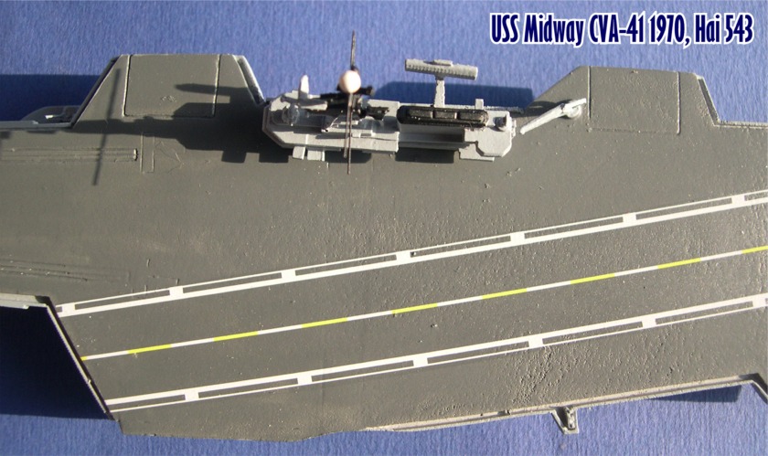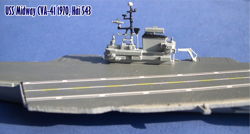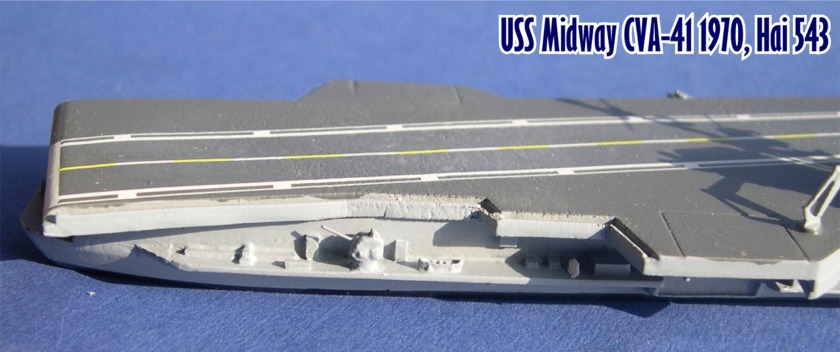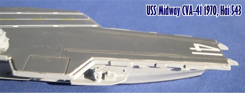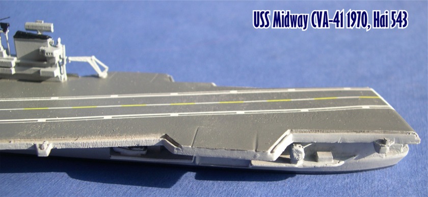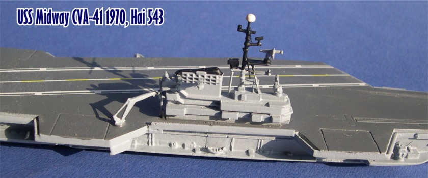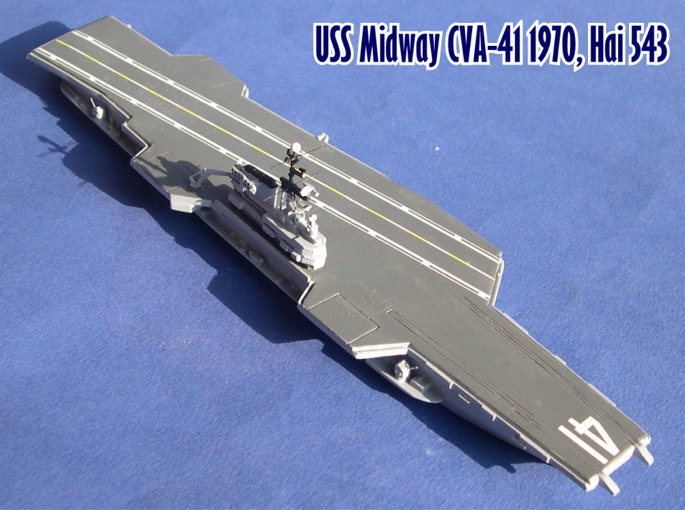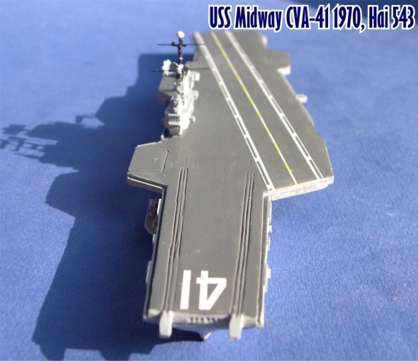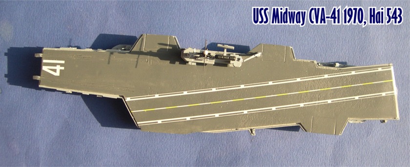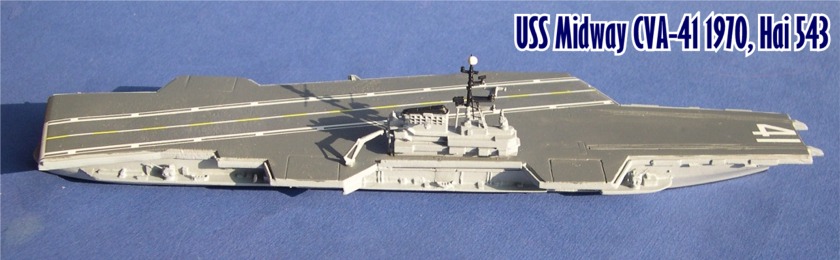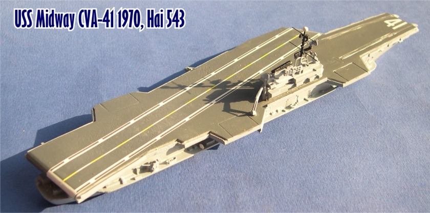 Hai has produced a 1:1250 scale model of the USS Midway CV-41 as of 1970. Hai 543 has deck marking but does not come with aircraft. The Hai Midway is available from Galerie Maritim.