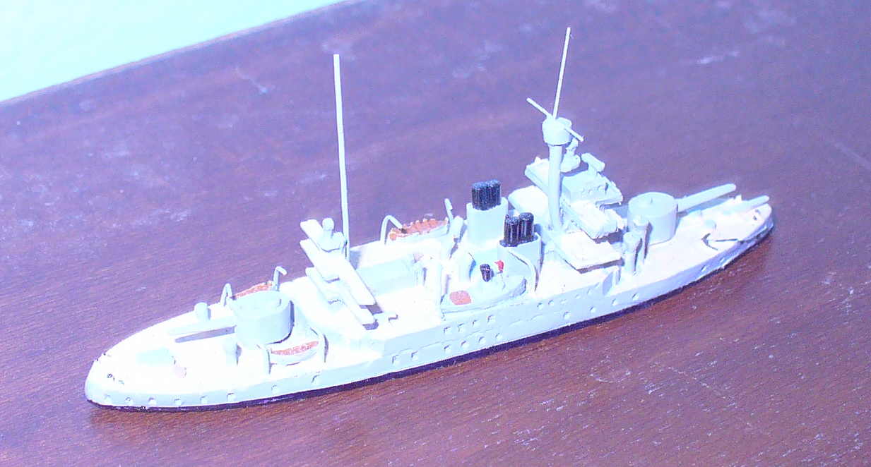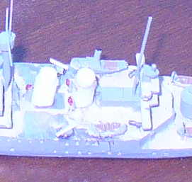 The final step was to repaint the funnel bases and gun bases and touch up the sides and any place showing a scuff a matching light grey. (I used Pactra IN57 light grey, lightened very slightly with a little Pactra tinting white.) Funnel caps where painted flat black, as were the 3.9 inch gun barrels. The deck color was matched using Pactra IN 60 deck tan, which was almost an exact match for the color used on the original deck. Finally, the entire model got a light coat of Testor’s dull coat. Then onto the shelf with the French Fleet.