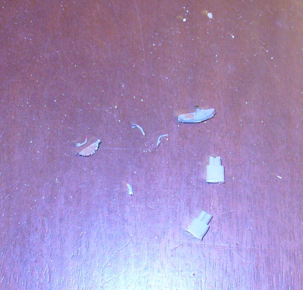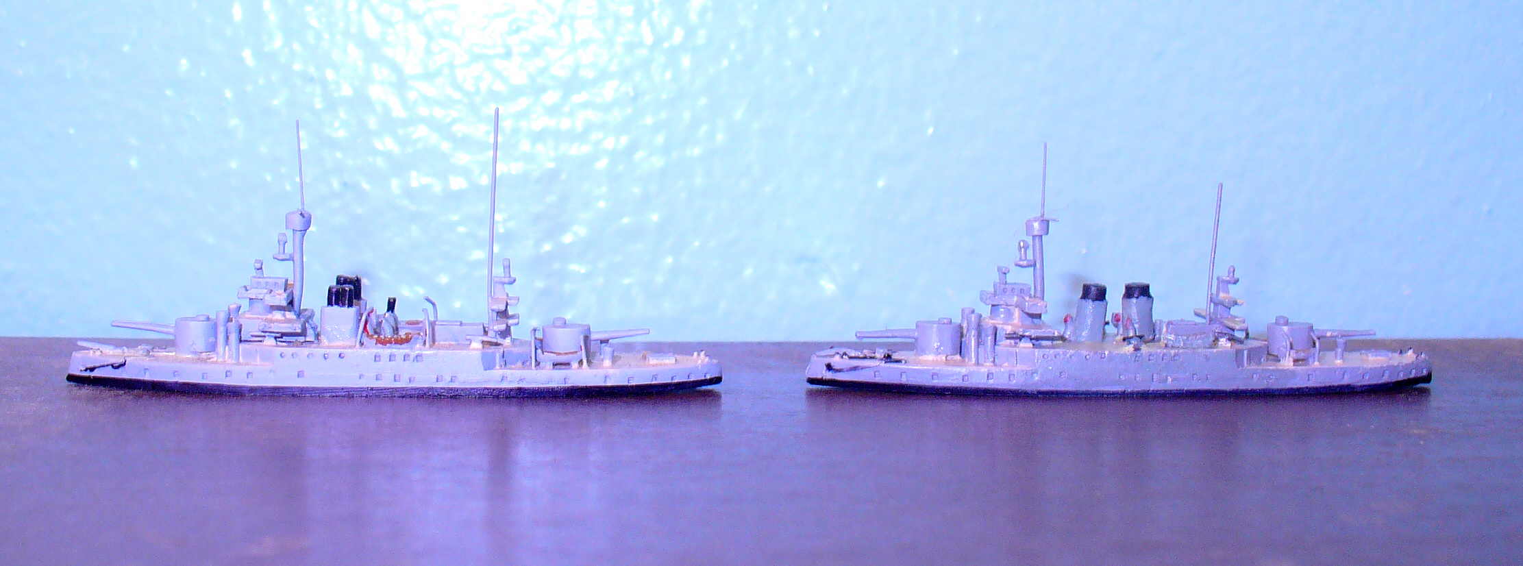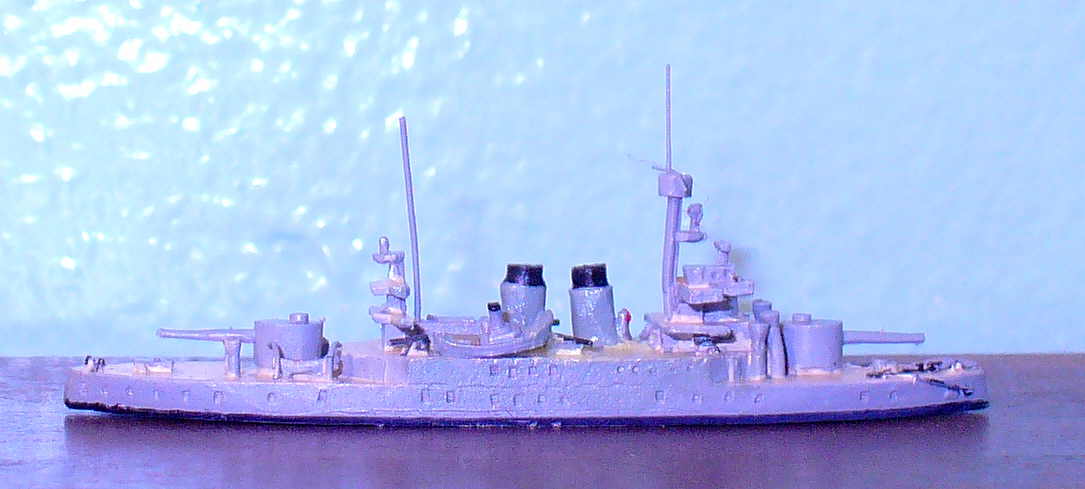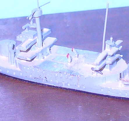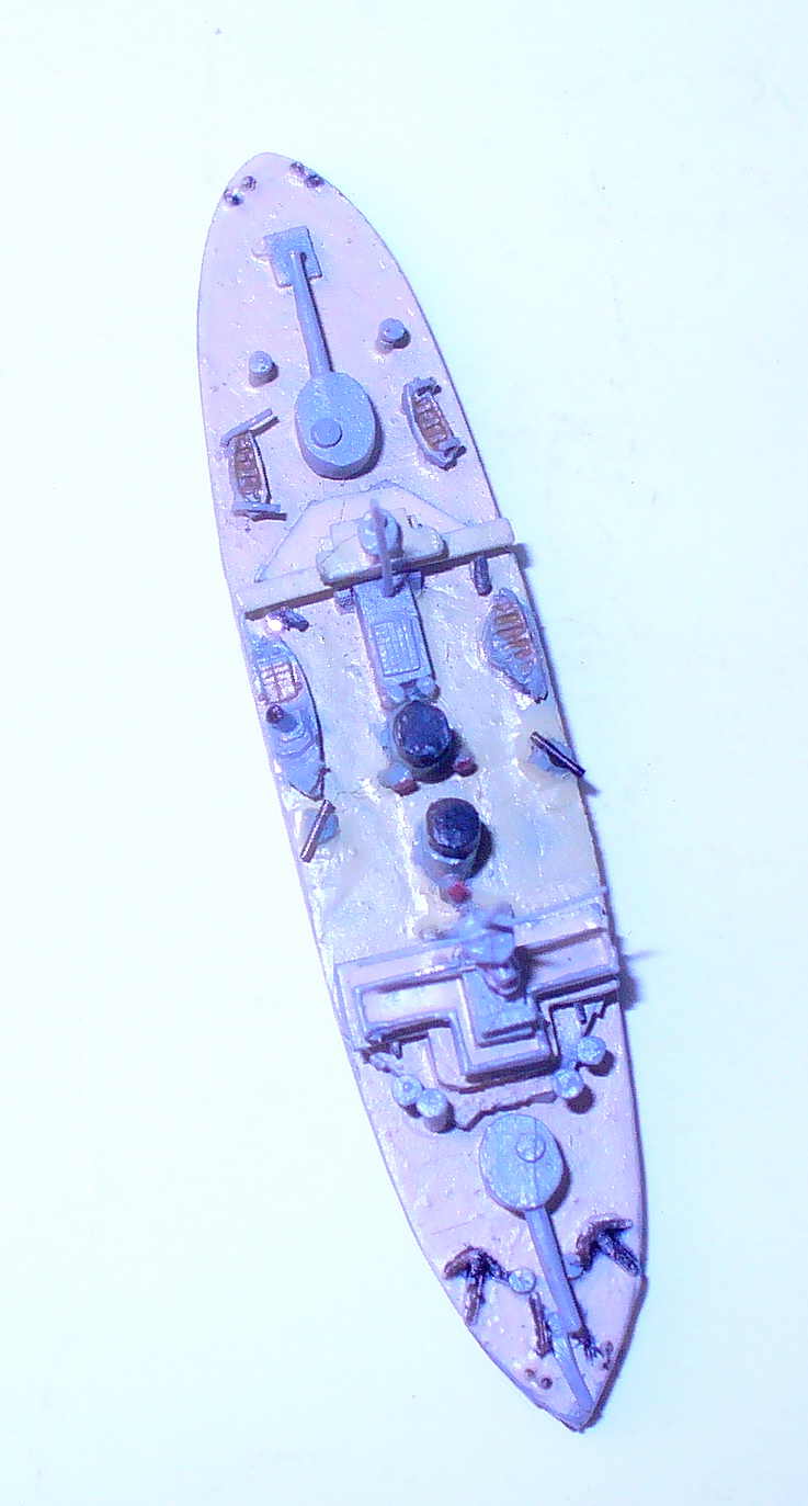 I had waited for 3 years to see if Hai would issue the World War I variant of the French Battleship Requin, but as none seems to be forthcoming, I decided to convert the 1896 version (Hai 422). The only plan I had of the reconstruction was one in Preston’s book on World War I Battleships. Although not in proper scale, it did have a deck plan showing general top view layout. However, a comparison with the two photographs I had in the proper time period showed several discrepancies that I could not reconcile. So I opted for the easiest conversion strategy: change as little as necessary. This turned out to be a relatively easy two evening project.