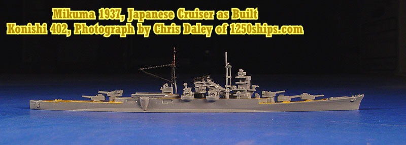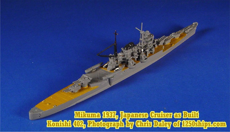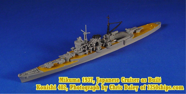 Mikuma, Konishi #402, depicts the original design and appearance upon completion for Mogami and Mikuma. Both were finished as light cruisers mounting fifteen 6.1-inch guns. Under the terms of the London Treaty of 1930 Japan had no further tonnage for construction of heavy cruisers and designed this class of large light cruisers. When Japan refused to ratify the London Treaty of 1935, plans were put in hand to remove the triple 6.1-inch mounts in Mogami and Mikuma and replace them with twin 8-inch mounts. Two other members of the class, Kumano and Suzya, were finished with the 8-inch guns, rather than 6.1-inch guns.