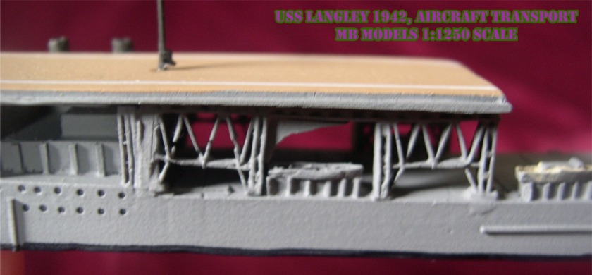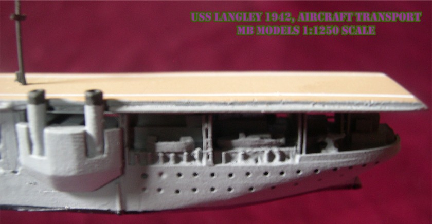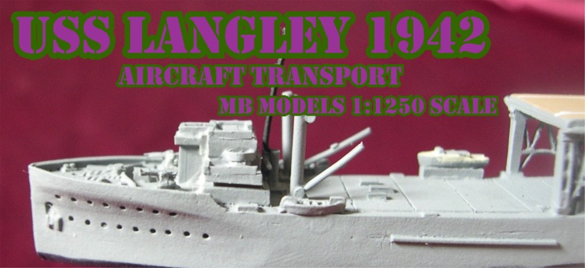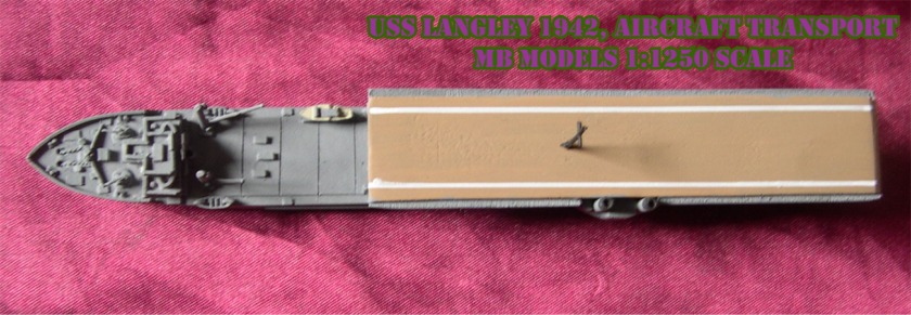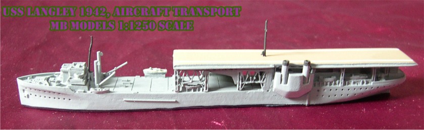 MB Models has two 1:1250 scale models of USS Langley AV-3 as she appeared in 1942. One is kit form, requiring assembly and painting. However, they also have an assembled painted version, as shown here. The Langley comes with five yellow-wing biplane fighters, which would be more appropriate for her career as an aircraft carrier, because she didn’t fly aircraft off her shortened flight deck.