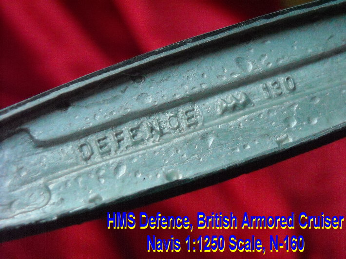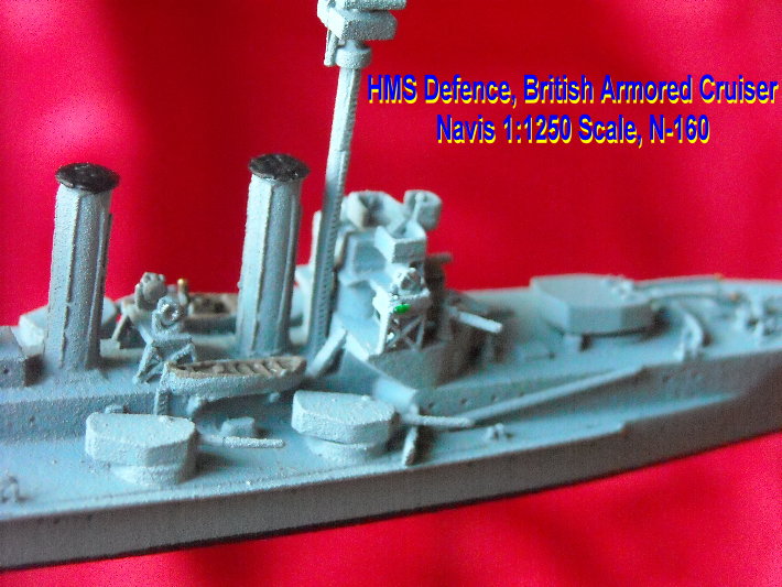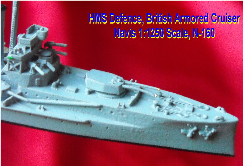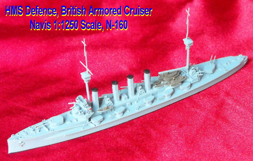 The armored cruiser craze took a dramatic turn with the British estimates of the 1905 program. The new design for an armored cruiser for that year was the brain child of Jackie Fisher and displayed in full his desire for speed and hitting power. Although called armored cruisers for several years, the Invincible class was the first of the battle cruisers. With her 12-inch guns and top speed of 26-knots Invincible was clearly far superior to any armored cruiser in existence. The bubble had been broken and navies that could afford the huge ships dropped the armored cruiser like a hot potato and started building battle cruisers. HMS Defence was laid down at Pembroke on February 22, 1905 and completed in 1908. She was the only one of the sisters to hit 23 knots on trials. At the start of World War One Defence was slated to join Rear Admiral Christopher Cradock's cruiser squadron but was diverted before joining. Defence would have certainly have put up a better fight at the Battle of Coronel against Admiral von Spee's Asiatic Squadron but her fight came in May 1916. The newer armored cruisers were deployed with the Grand Fleet at the Battle of Jutland. All they proved was that they didn't belong in the same arena with German battle cruisers. HMS Defence was blown up with the loss of all hands. The Navis neu range has this beautiful model of HMS Defence.