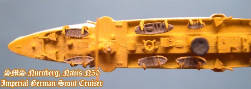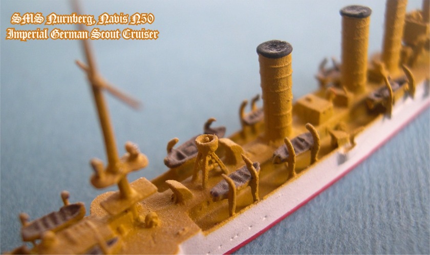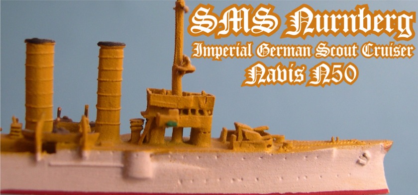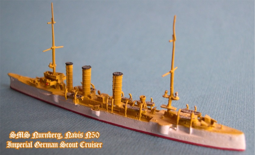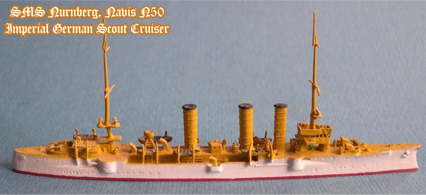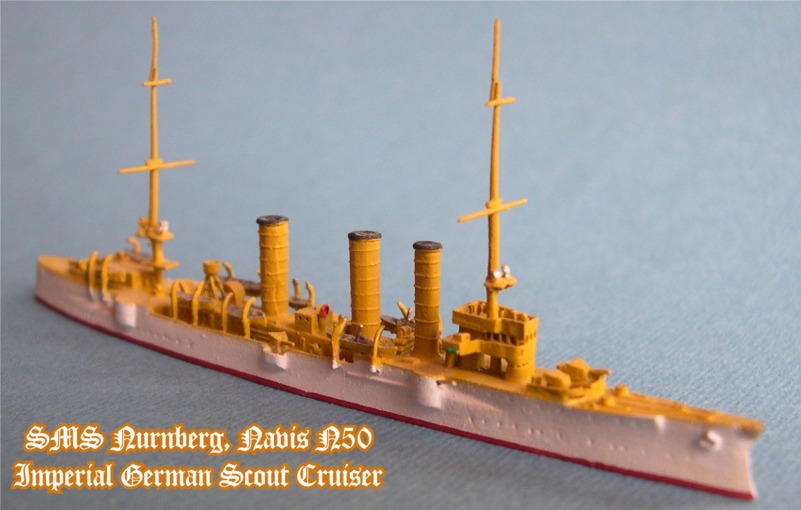 Navis produces two versions of the Nurnberg. This is # 50S in the white and buff colors of the German East Asiatic Squadron. The other version is #50, in gray war paint, as she appeared at the Battles of Coronel and the Falkland Islands. The Navis Nurnberg, as well as the entire Navis/Neptun line, are available from Galerie Maritim, which carries a huge inventory of new and pre-owned 1:1250 scale models.
