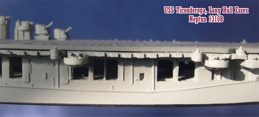 The original Essex and the earlier ships in the class were 872 feet in length, and were later to be called the Short-Hull Essex. As finished, the ships of the short-hull variant had a single quadruple 40mm mount on the forecastle underneath the front edge overhang of the flight deck. It was quickly discovered that this bow AA position was almost useless as its field of fire was extremely constricted because of the overhang of the flight deck. The solution was to lengthen the bow and cut back the forward edge of the flight deck. An additional sixteen feet was added to the design with a lengthened bow and a stern sponson for two quadruple Bofors mounts. Dramatically, the above water shape was completely changed. Gone was the rounded shape of the short-hull variant and in its place was a more dramatic and lengthier Clipper Bow cutwater upon which a squared off forecastle deck rested. By lengthening, widening and squaring off the forward tip of the bow, two quadruple Bofors could be fitted, rather than one and by lengthening the hull by 16 feet to 888-feet OA and reducing the forward edge of the flight deck by 11 feet, these mounts had a clear field of fire.