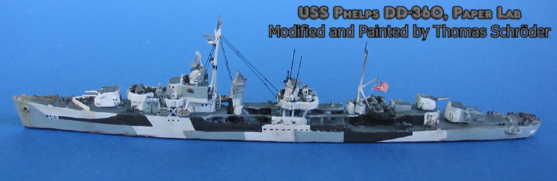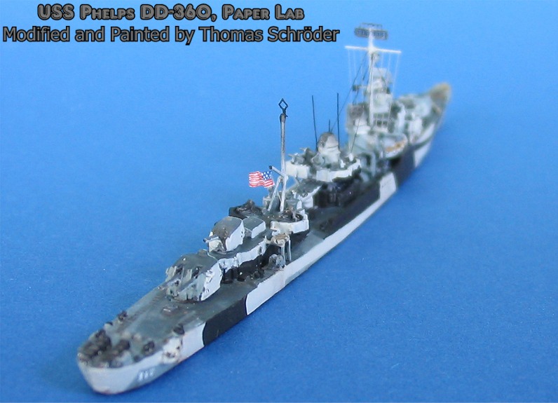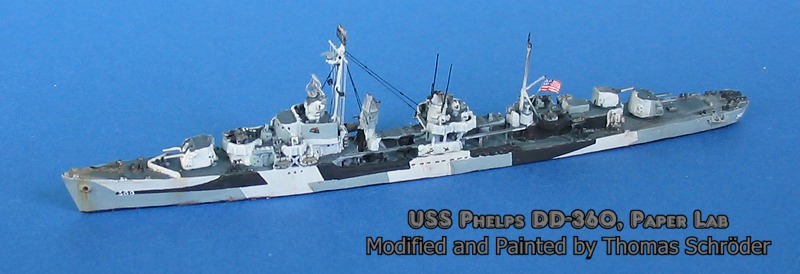 Last year I bought the new model, USS Phelps from Paper Lab, and was amazed of that quality . At the same time I checked the few number of possible improvements and here is the result. It seems to be incredible, but it is possible to do some improvements on the new Paper Lab Models, like in this case, USS Phelps, DD 360 /TH-002A. Besides the camouflage in Measure 32/3D and the national flag, there are new Radars on the main mast and on the MK 37 5" gun director. A HF/DF radio direction finder for submarines is seen on the rear mast and some antennas on the rear funnel, as well as some cables and other small details for the main mast are added . The very small black painted strokes are made by a pencil for drawing ink in thickness 0.13mm.