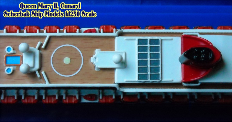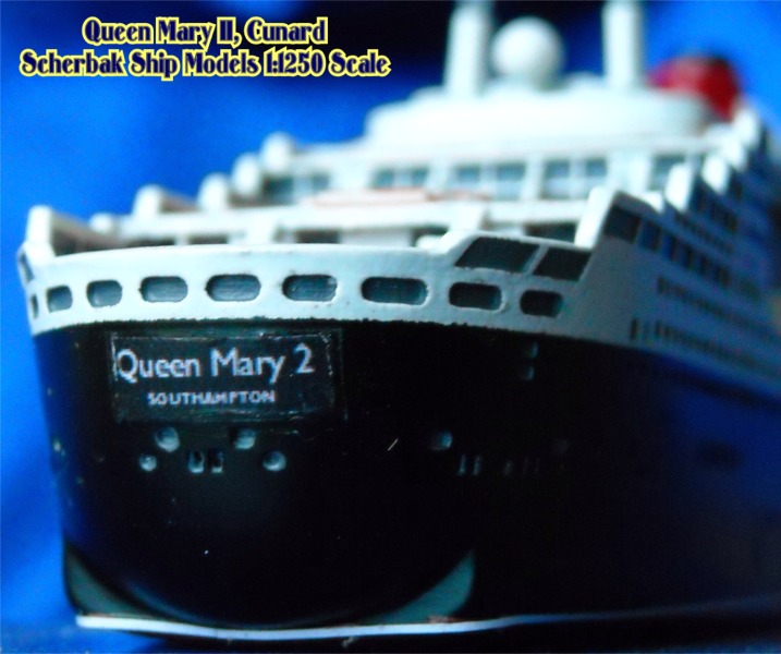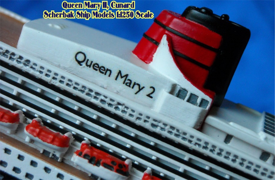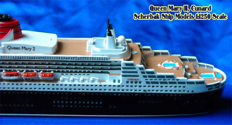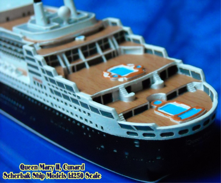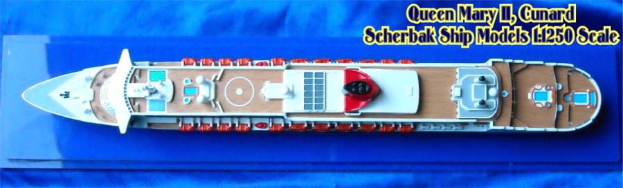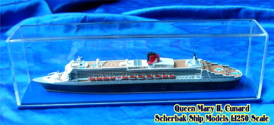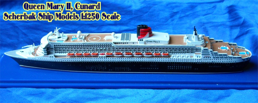 Scherbak Ship Models has two highly detailed 1:1250 scale models of the Queen Mary 2. One version is in here appearance as originally entering service with Cunard. The second version, seen here is of the Queen Mary 2 after she was fitted with bridge wing extensions presenting her present day appearance. The model is made of resin, comes completely painted and is enclosed in its own display case.