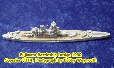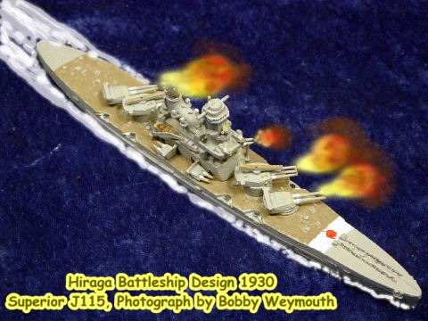 In early 1930, Japan was interested in new battleship designs as the battleship Building Holiday due to the Washington Treaty was due to expire in 1931. Two designs were submitted, the Fujimoto design and the Hiraga design. Both designs have unusual features. The Fujimoto design carries their secondary guns both fore and aft of the main battery turrets, two forward and for aft. A catapult is mounted atop C turret. The Hiraga design carries her secondary guns in mixed arrangement: 4 twin turrets and eight single casemate mounts. Captain K. Fujimoto was the chief designer of the Navy Technical Bureau and Admiral Y. Hiraga was Director of the Naval Technical Research Laboratory. The former was responsible for many designs including the Mogami class cruisers, Fubuki class destroyers and the Tomodzoru class TB's.
