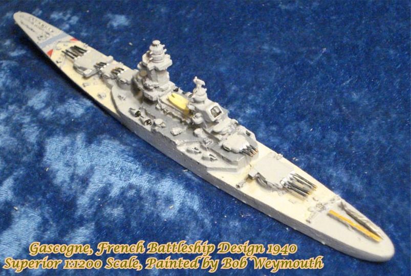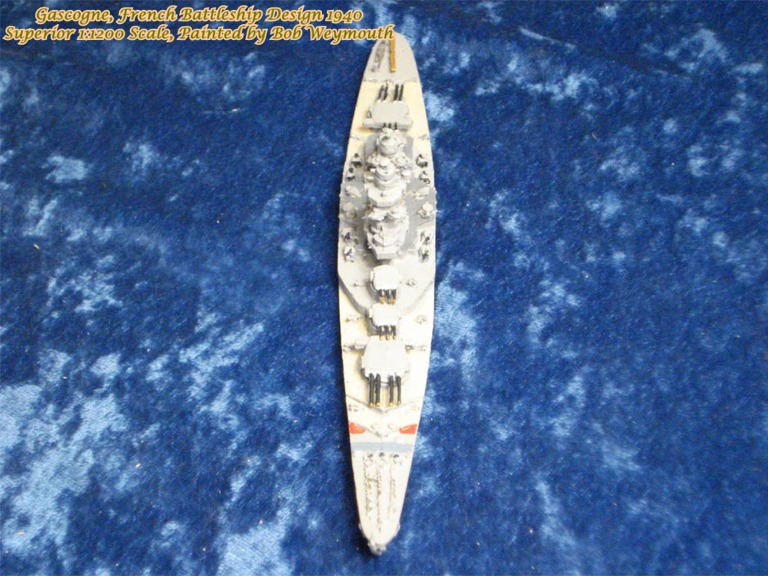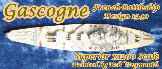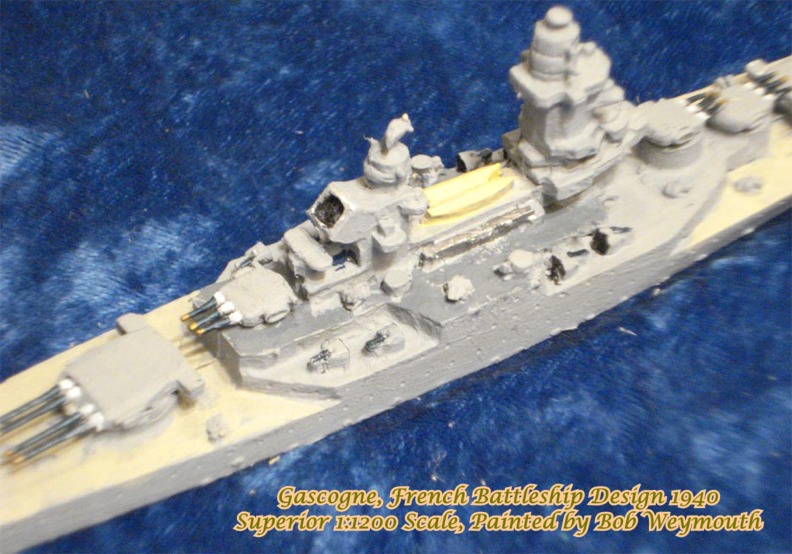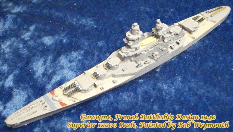 As the fourth unit of the Richelieu class, the Gascogne 1940 design had the main battery arranged fore and aft and the secondary battery placed entirely on the center line. The invasion of France prohibited start of work on this vessel.