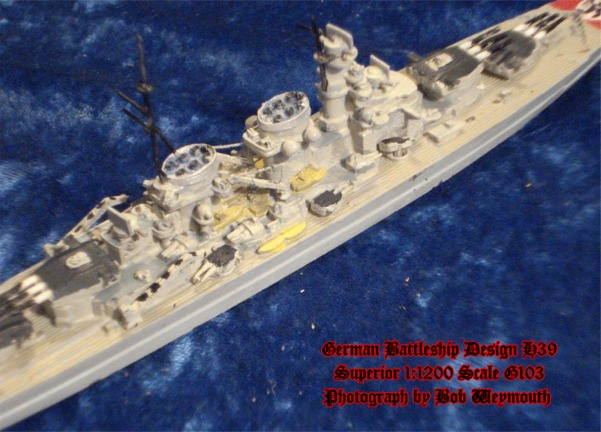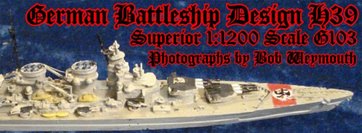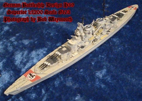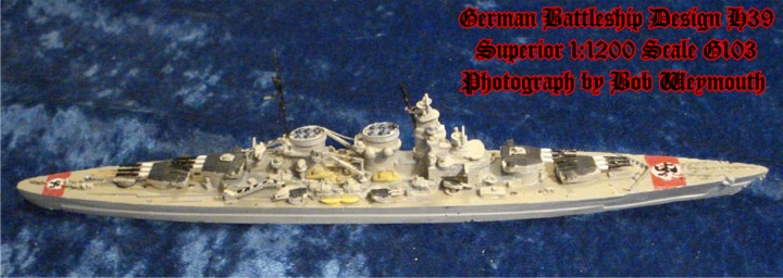This is the German battleship design H39 with twelve 15inch guns. Of approximately 52,600 tons standard displacement and with diesel engines, this class formed the core of the Z-Plan. Construction was planned to commence in late 1939 with the last of six to be completed by 1944. This model is the Superior/Alnavco G103 in 1:1200 scale and shows an alternative armament scheme.